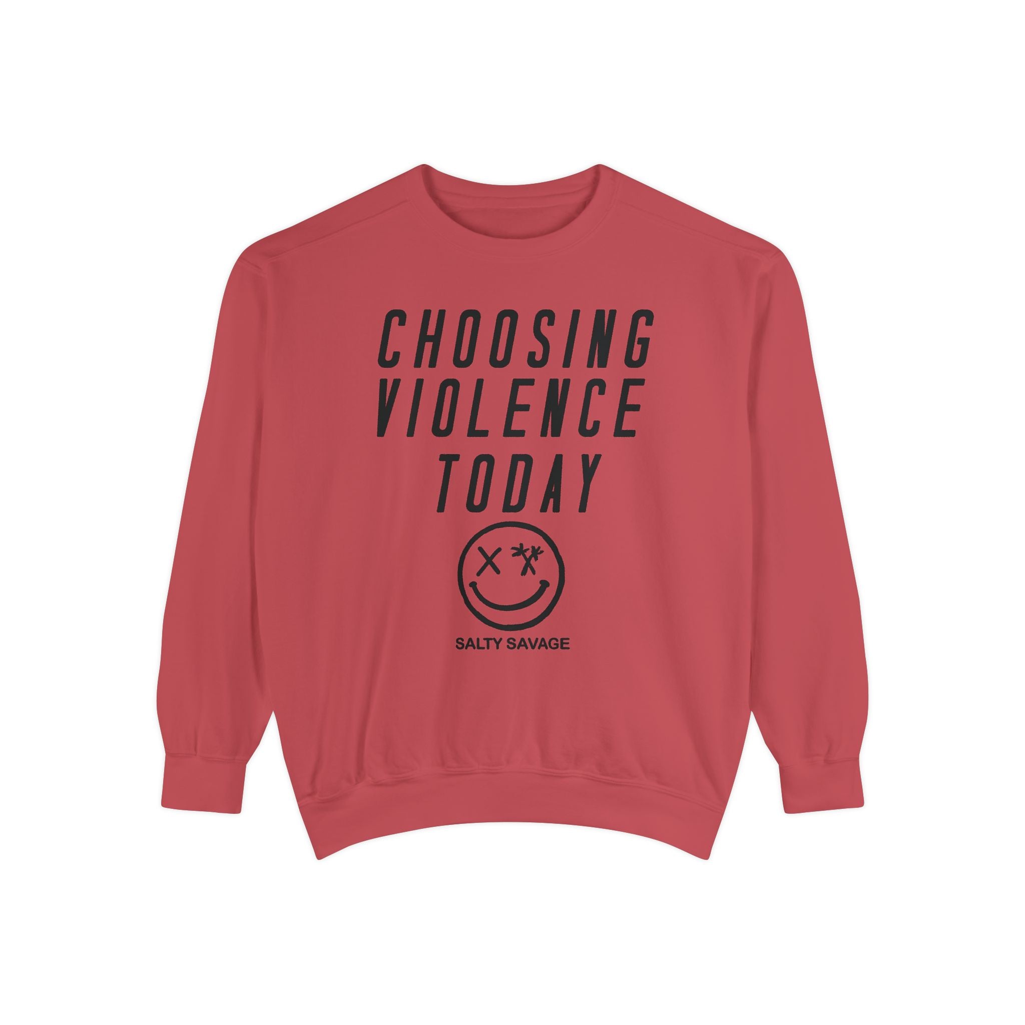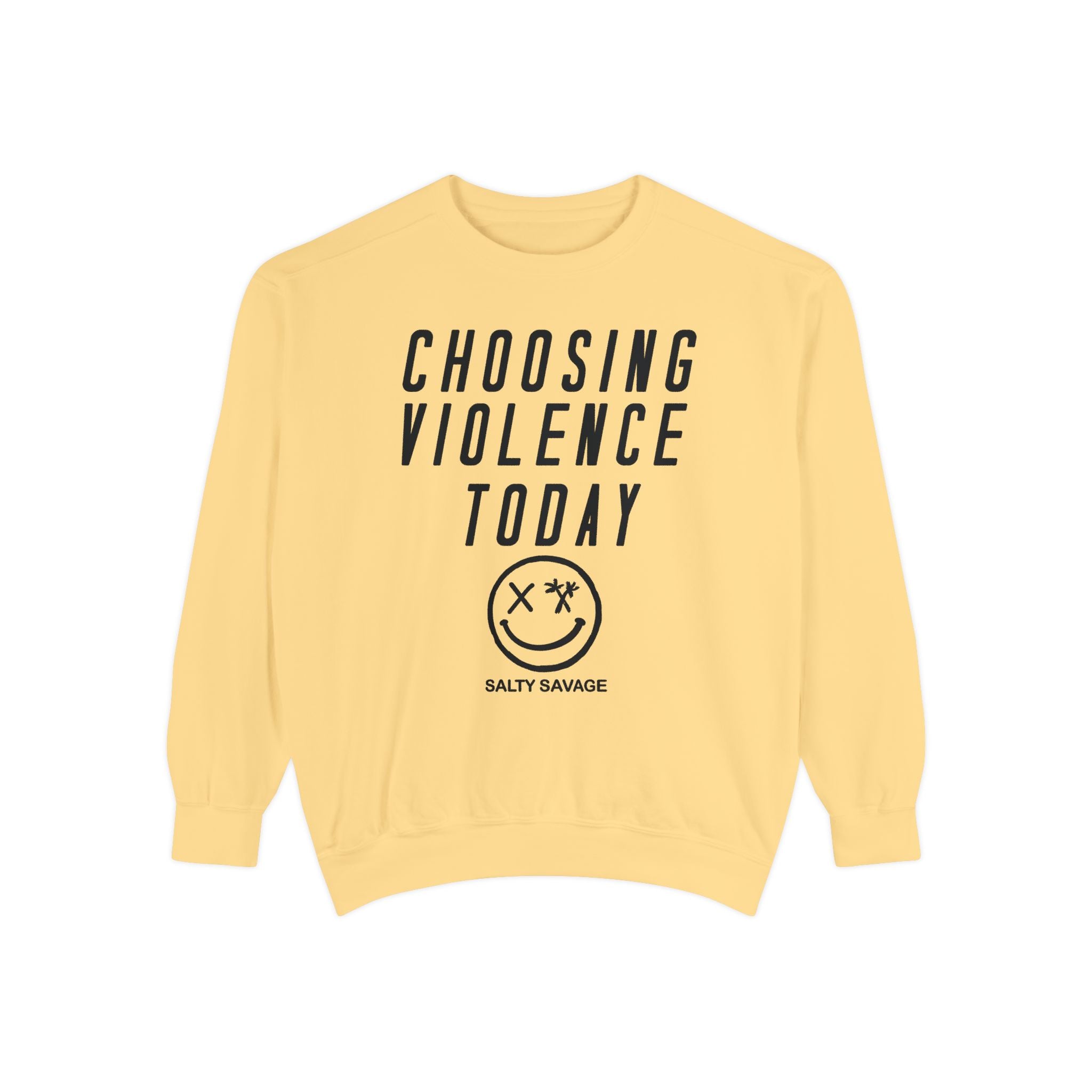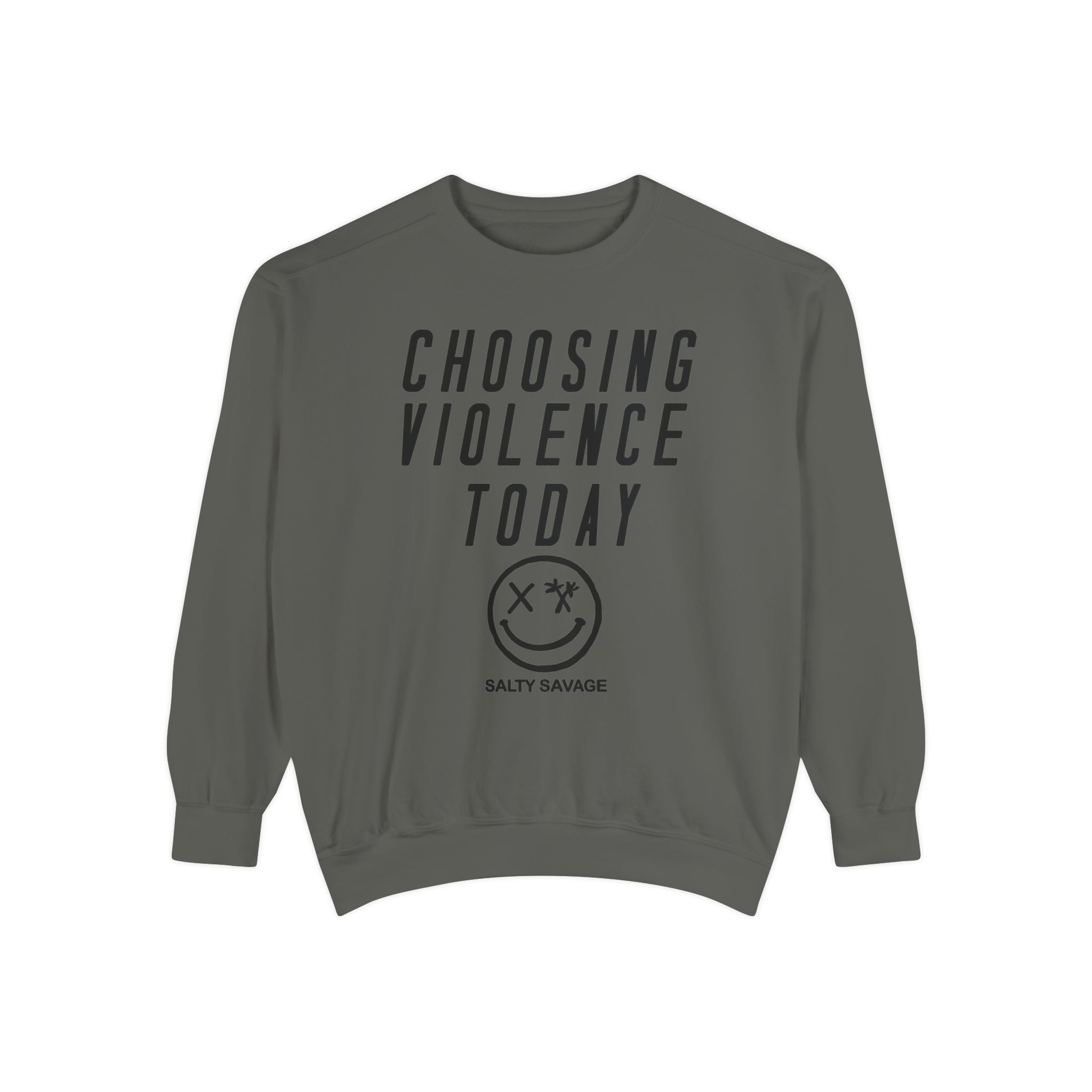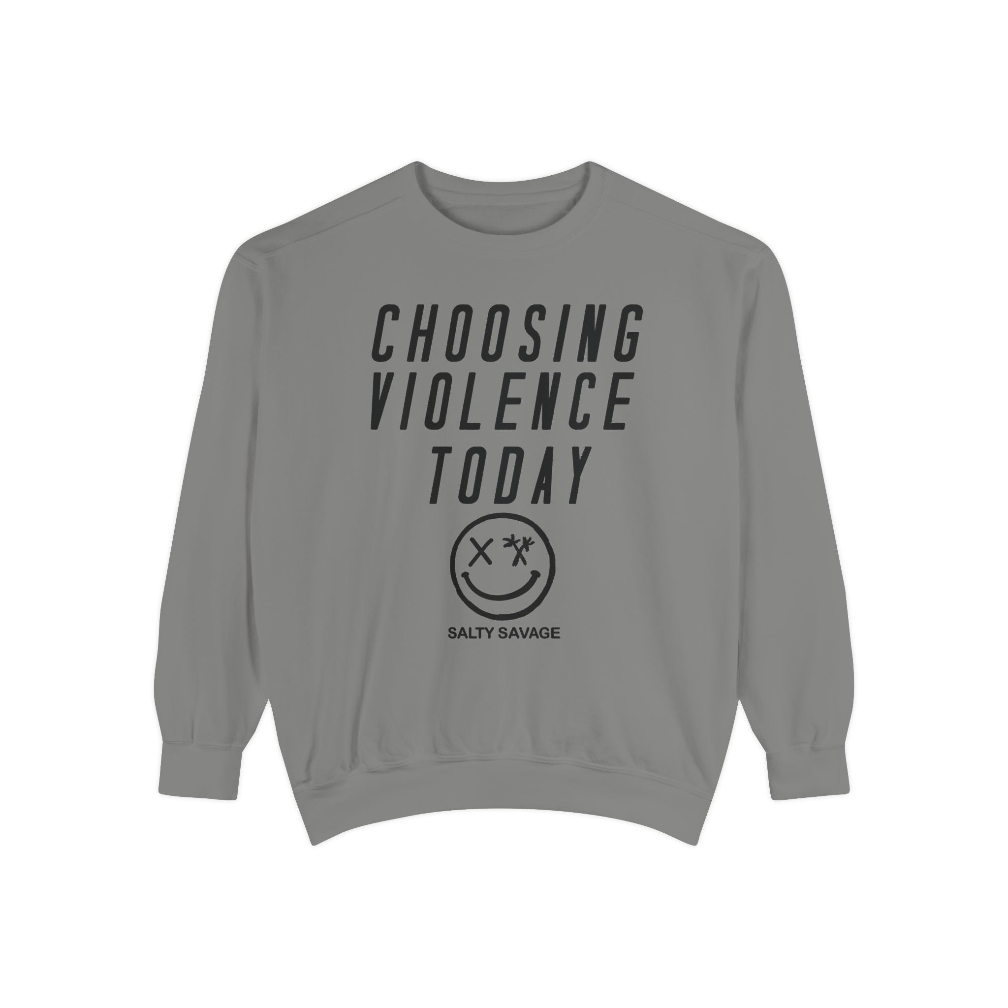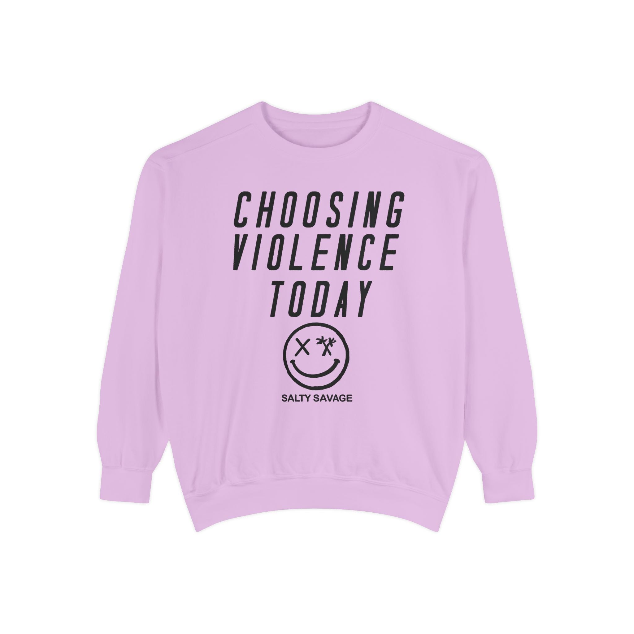 This relaxed-fit garment-dyed sweatshirt carries a raw, streetwise attitude. The front reads “CHOOSING VIOLENCE TODAY” above a distressed smiley-and-crossbones motif, giving the piece a gritty, rebellious voice that’s both ironic and bold. The medium-heavy 80/20 ring-spun cotton/poly fabric feels substantial and soft, and the ribbed collar, cuffs and hem hold shape while letting the sweatshirt drape just right. Small details — a half-moon neck patch, twill neck tape and a sewn-in label — add durability and a lived-in finish. It slides easily into everyday wear for nights out, skate sessions, or nights when you want your look to do the talking.