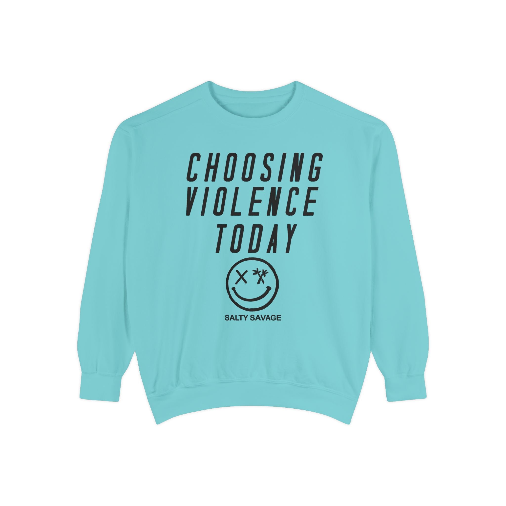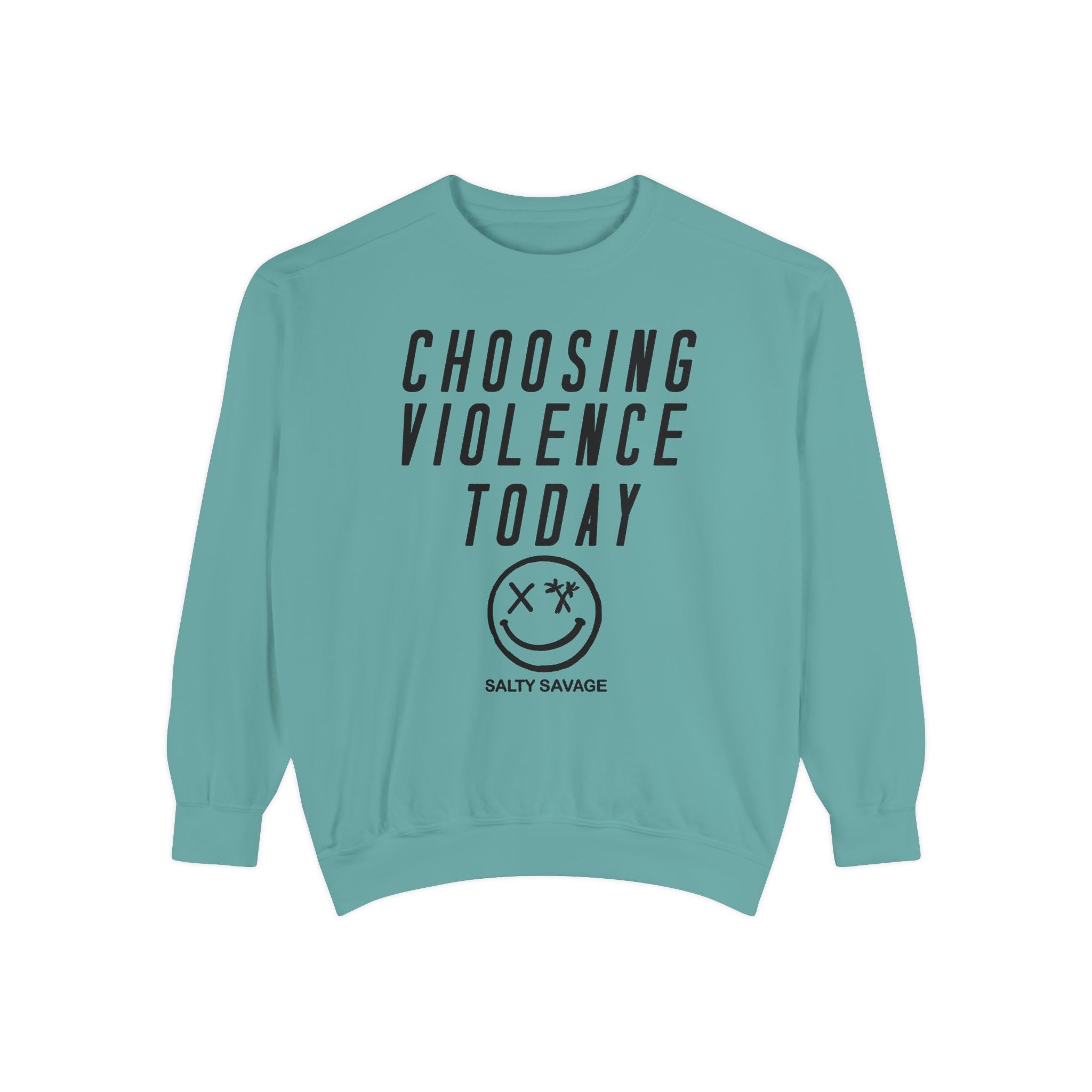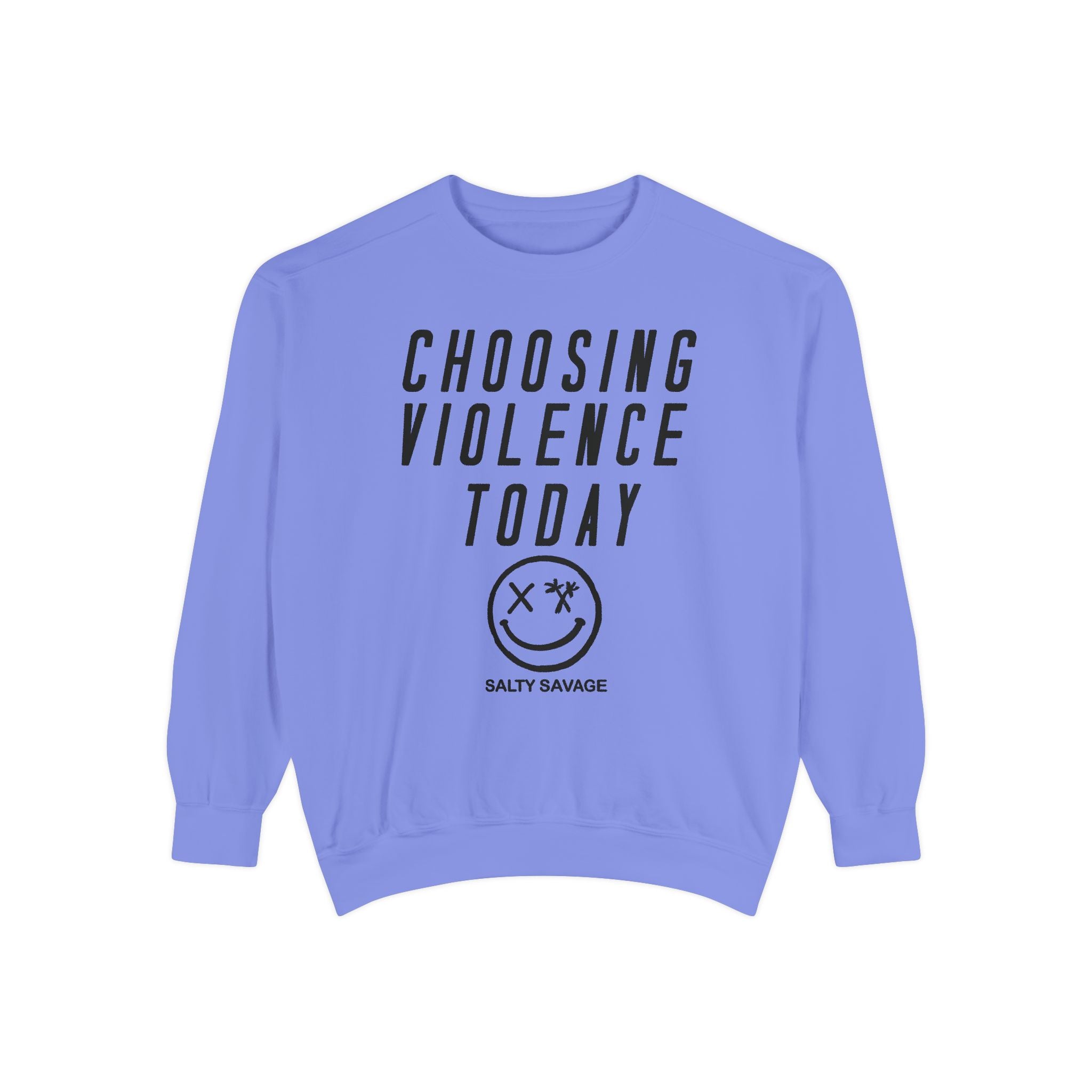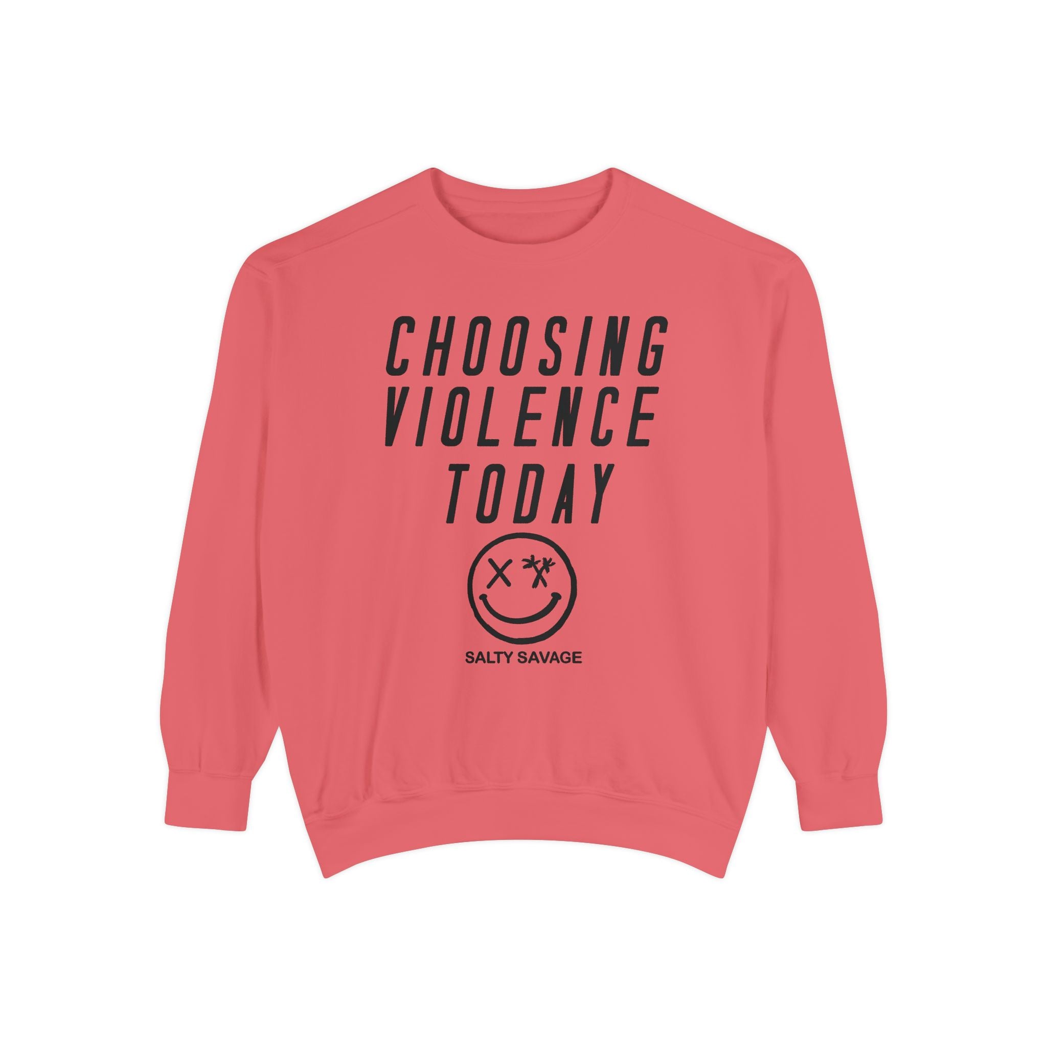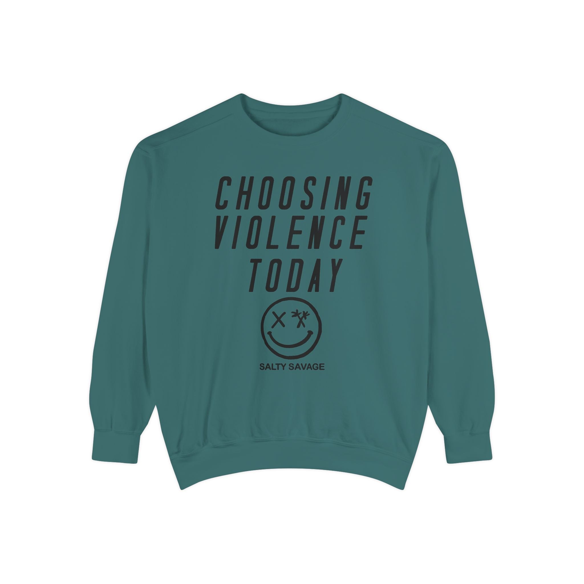 This relaxed-fit garment-dyed sweatshirt carries a raw, streetwise attitude. The front reads “CHOOSING VIOLENCE TODAY” above a distressed smiley-and-crossbones motif, giving the piece a gritty, rebellious voice that’s both ironic and bold. The medium-heavy 80/20 ring-spun cotton/poly fabric feels substantial and soft, and the ribbed collar, cuffs and hem hold shape while letting the sweatshirt drape just right. Small details — a half-moon neck patch, twill neck tape and a sewn-in label — add durability and a lived-in finish. It slides easily into everyday wear for nights out, skate sessions, or nights when you want your look to do the talking.