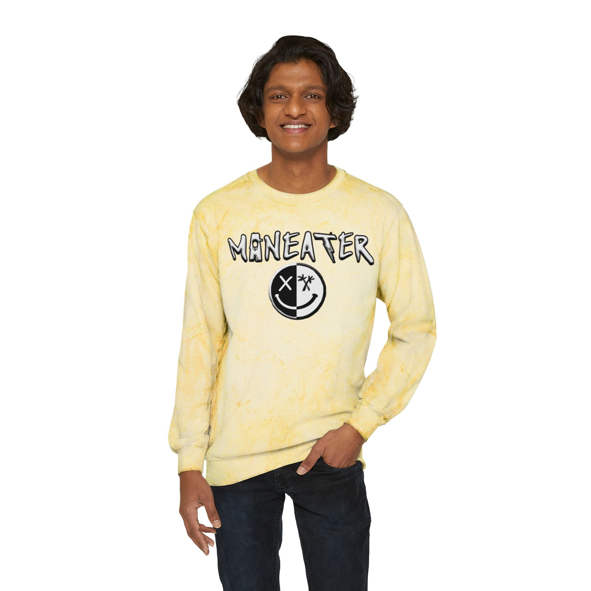 This relaxed crewneck brings a sun-faded, lived-in energy to streetwear rotation. The garment-dyed, soft cotton blend wears in softly and shows off a subtle yellow tie-dye wash that feels handcrafted. Graphic lettering across the chest and a bold circular smiley emblem add a raw, slightly punk attitude without shouting — the kind of sweatshirt you pull on for late-night skate runs, coffee with friends, or when you want something comfy that still has edge. The midweight fabric and relaxed cut drape easily over layers; reinforced seams and necktape mean it keeps its shape through repeat wear. It’s for people who like vintage textures, hand-finished color, and designs that read like a personal statement rather than a logo parade.