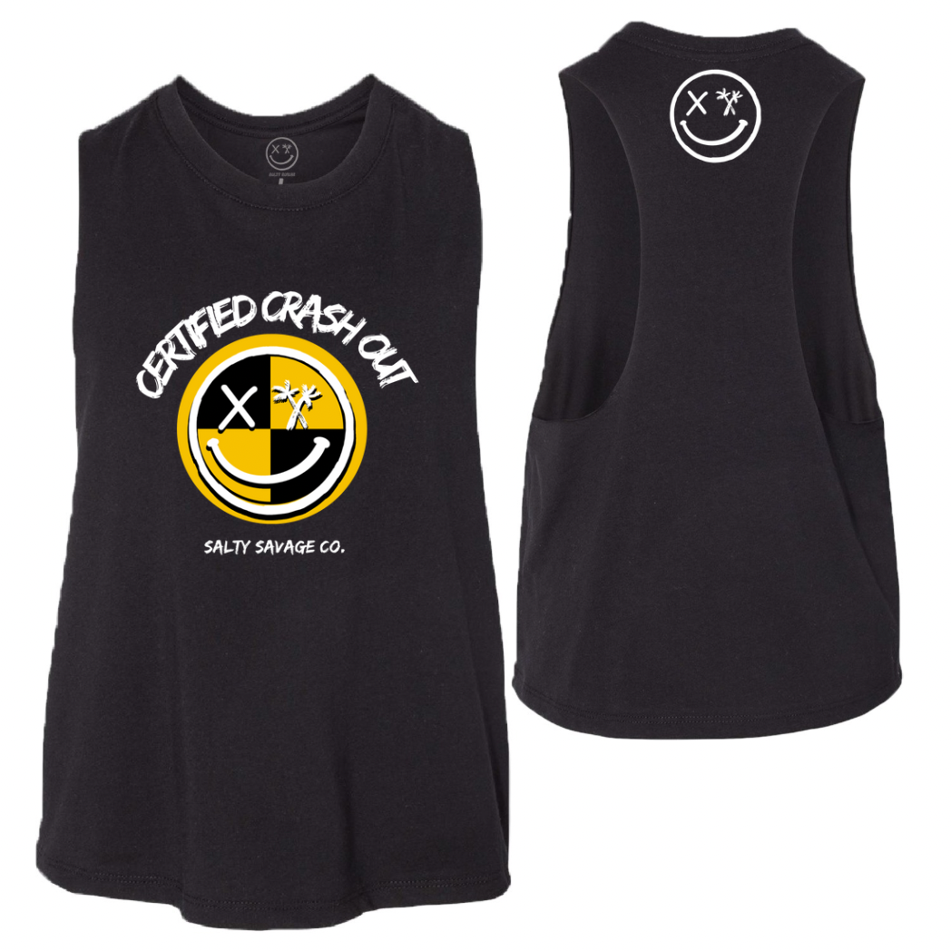 Ladies "CERTIFIED CRASH OUT" Flowy Crop Tank - Black / Small is backordered and will ship as soon as it is back in stock.