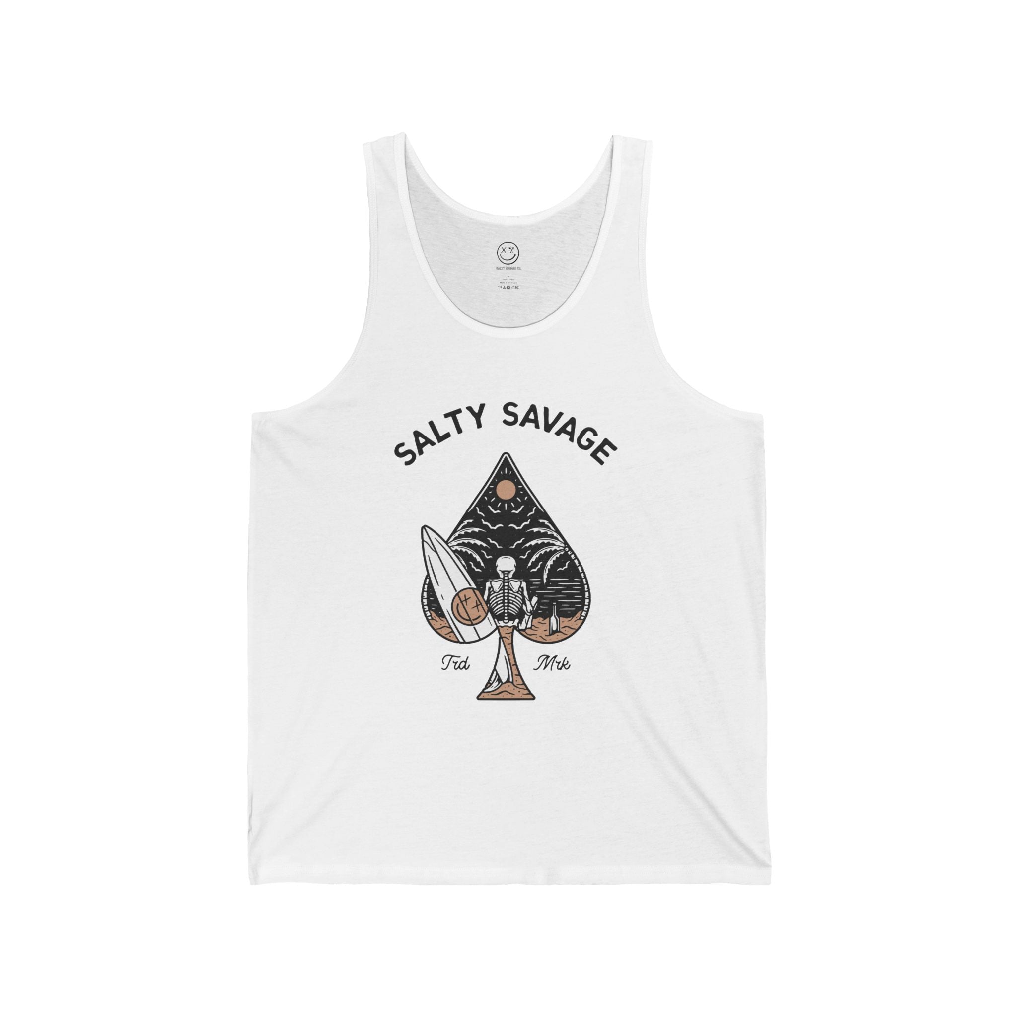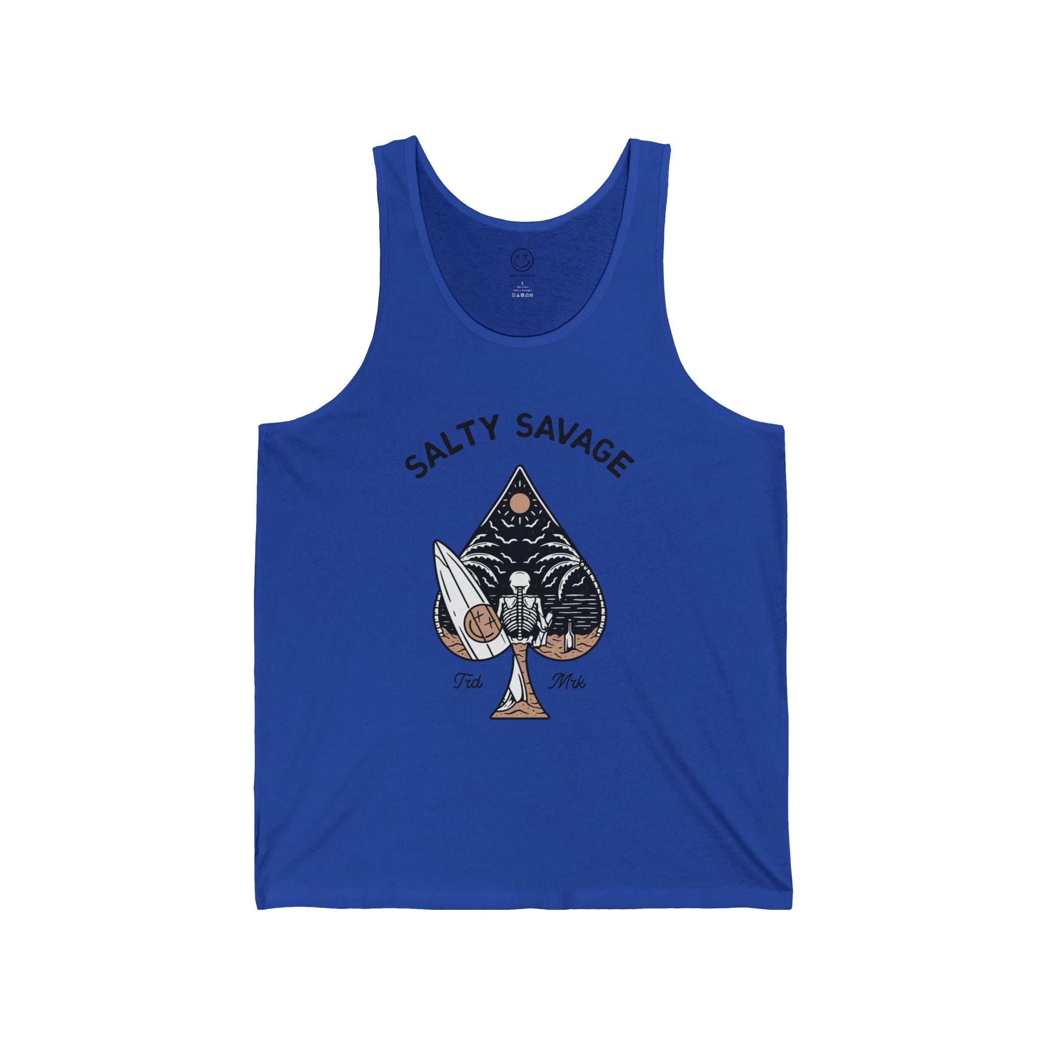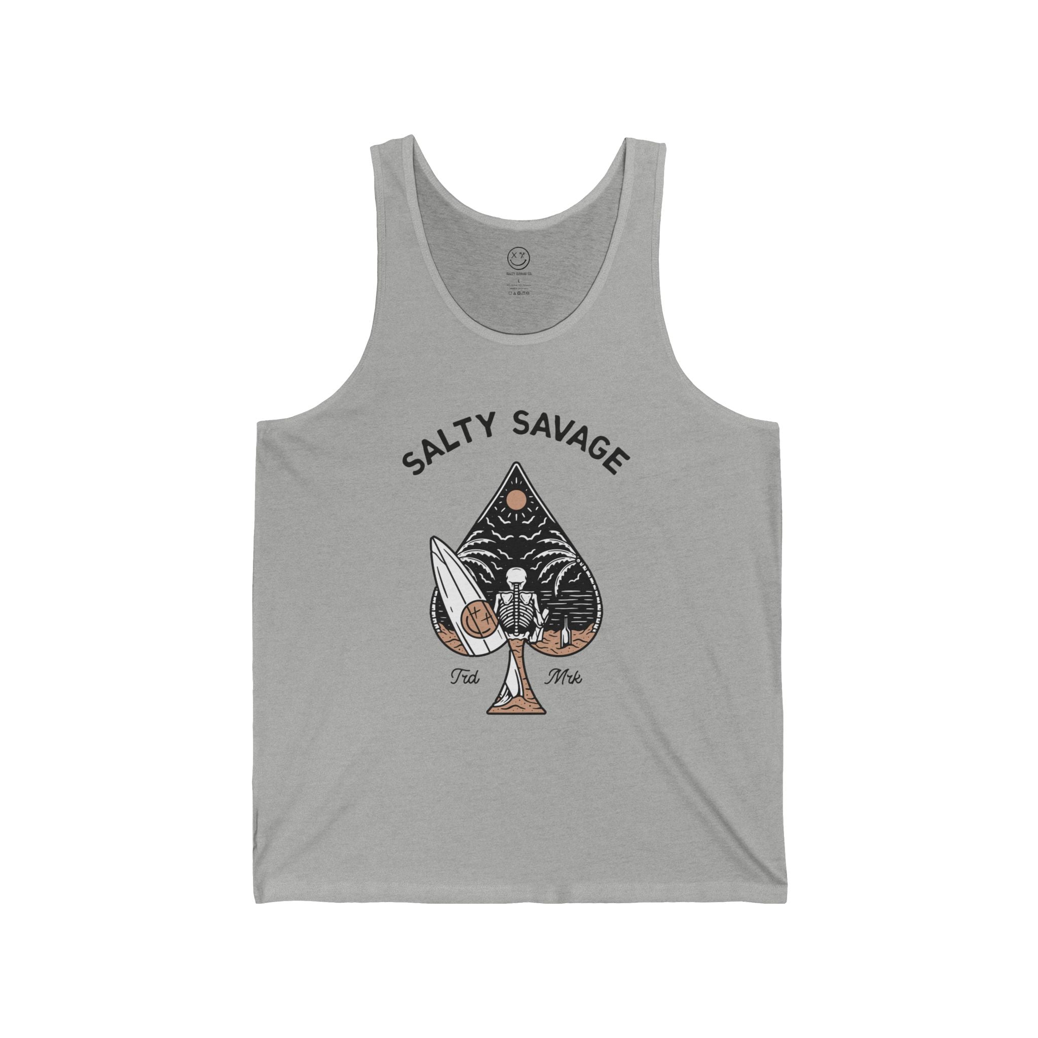 Salt-kissed afternoons and wind-tousled hair live in this light, breathable tank. The design — a stylized spade-shaped wave scene with surfboard and helmet details and the words “Salty Savage” — feels like a quiet nod to people who chase swell and solitude. Wear it after a dawn paddle, layered under an open linen shirt at the pier, or folded into a beach pack for spontaneous sessions. The retail fit and airy fabric let movement lead: paddle, coil, sprint, breathe. The tear-away label keeps the back free from itch when you’re sunning or swimming. Made with care and built to keep its shape, this tank settles into your rotation and into those salt-stained memories.