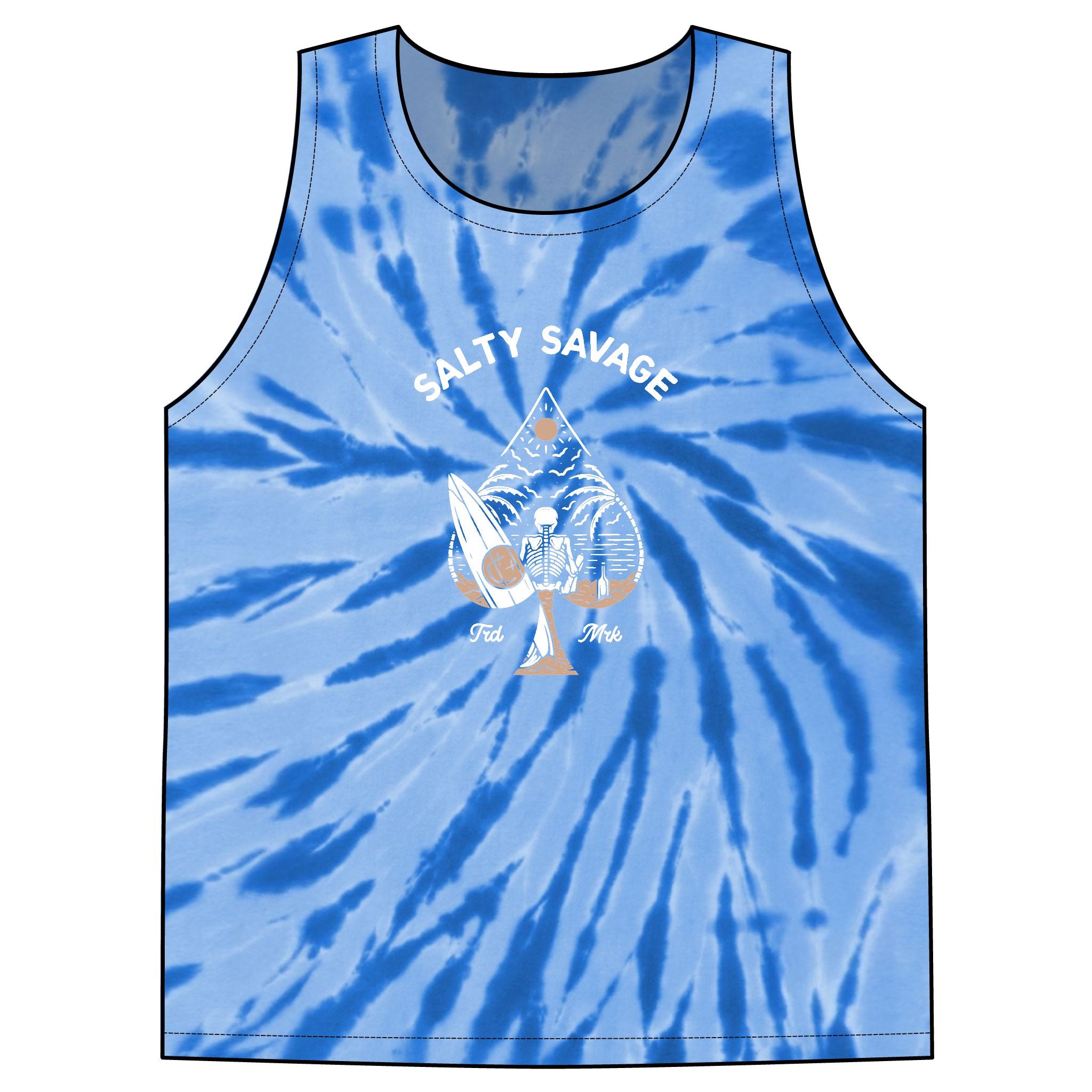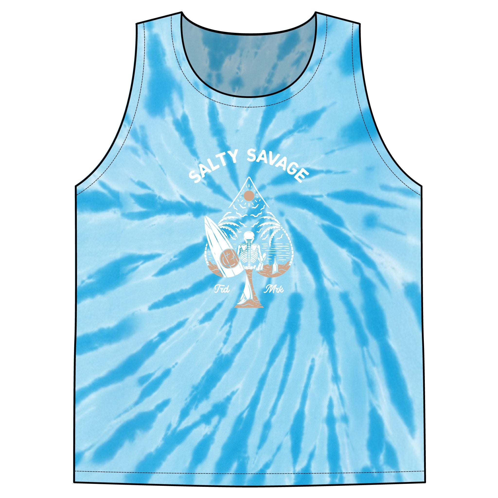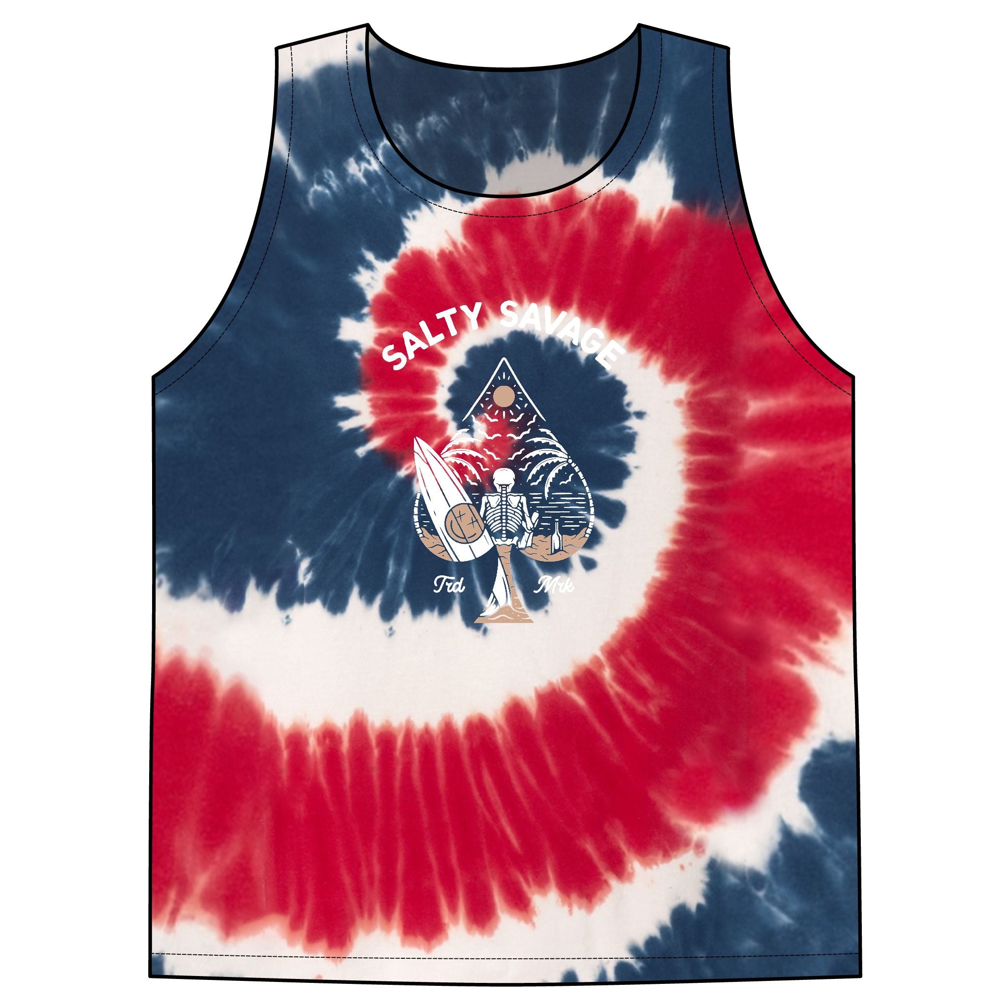 This vibrant tie-dye tank brings sunny, beach-day energy to casual summer wardrobes. Lightweight 100% cotton breathes on hot afternoons while the spiral rainbow pattern ensures each piece feels one-of-a-kind. Centered white artwork adds a laid-back surf-and-saltwater vibe — wear it for longboard sessions, bonfire nights, or backyard hangouts. The standard cut layers easily over swimwear or pairs with denim shorts for an effortless, lived-in look that ages well with every wash.