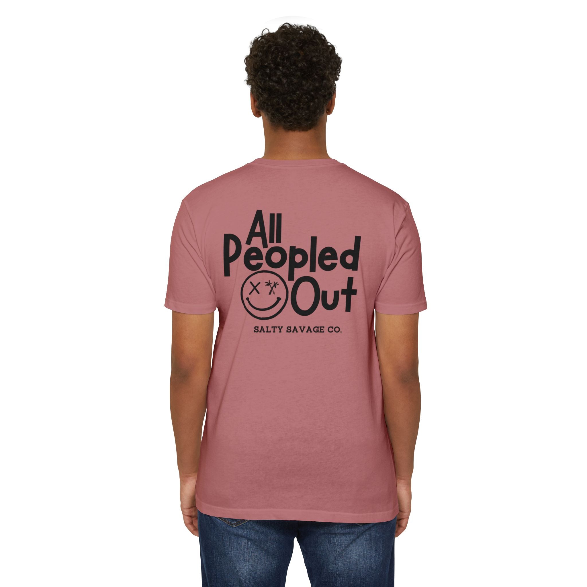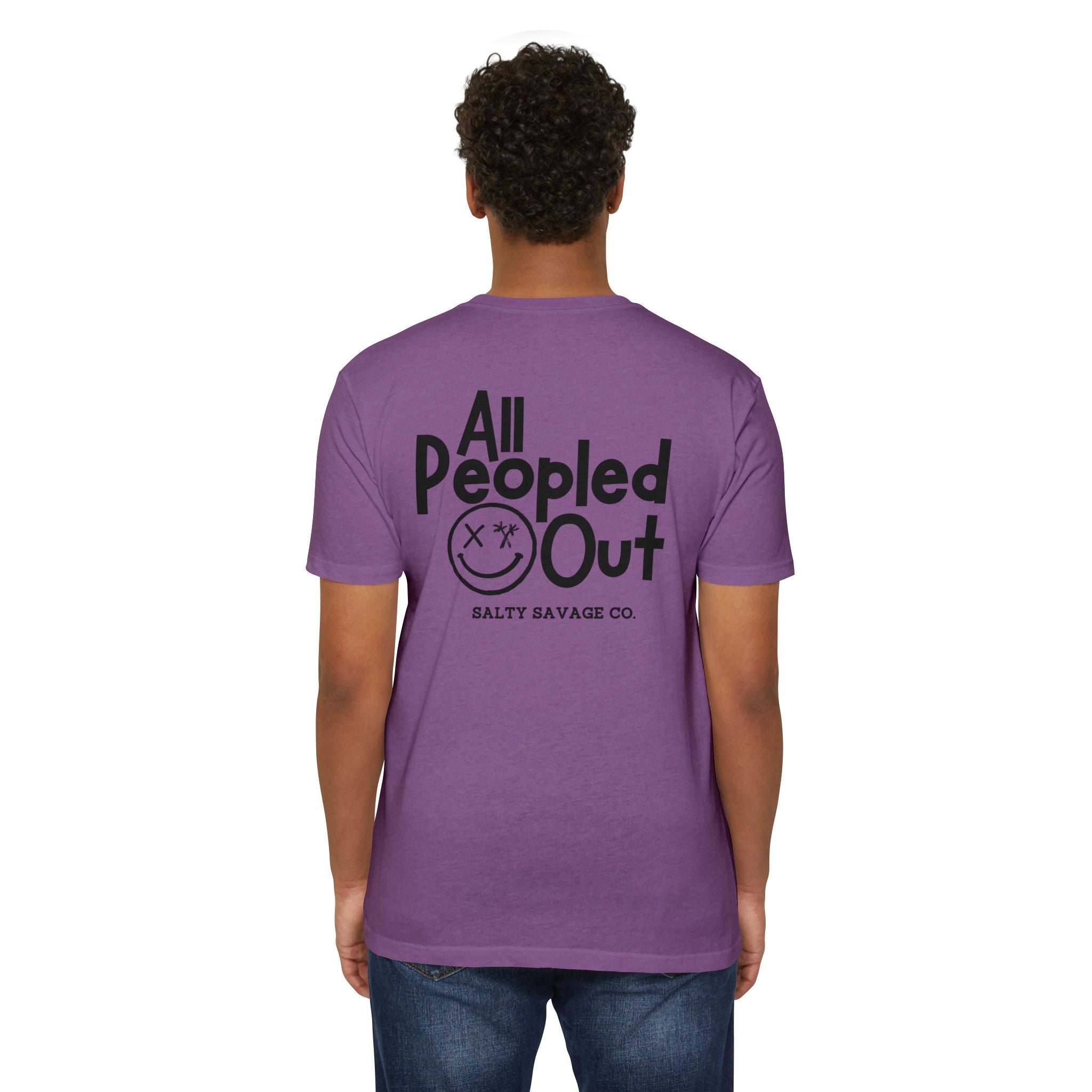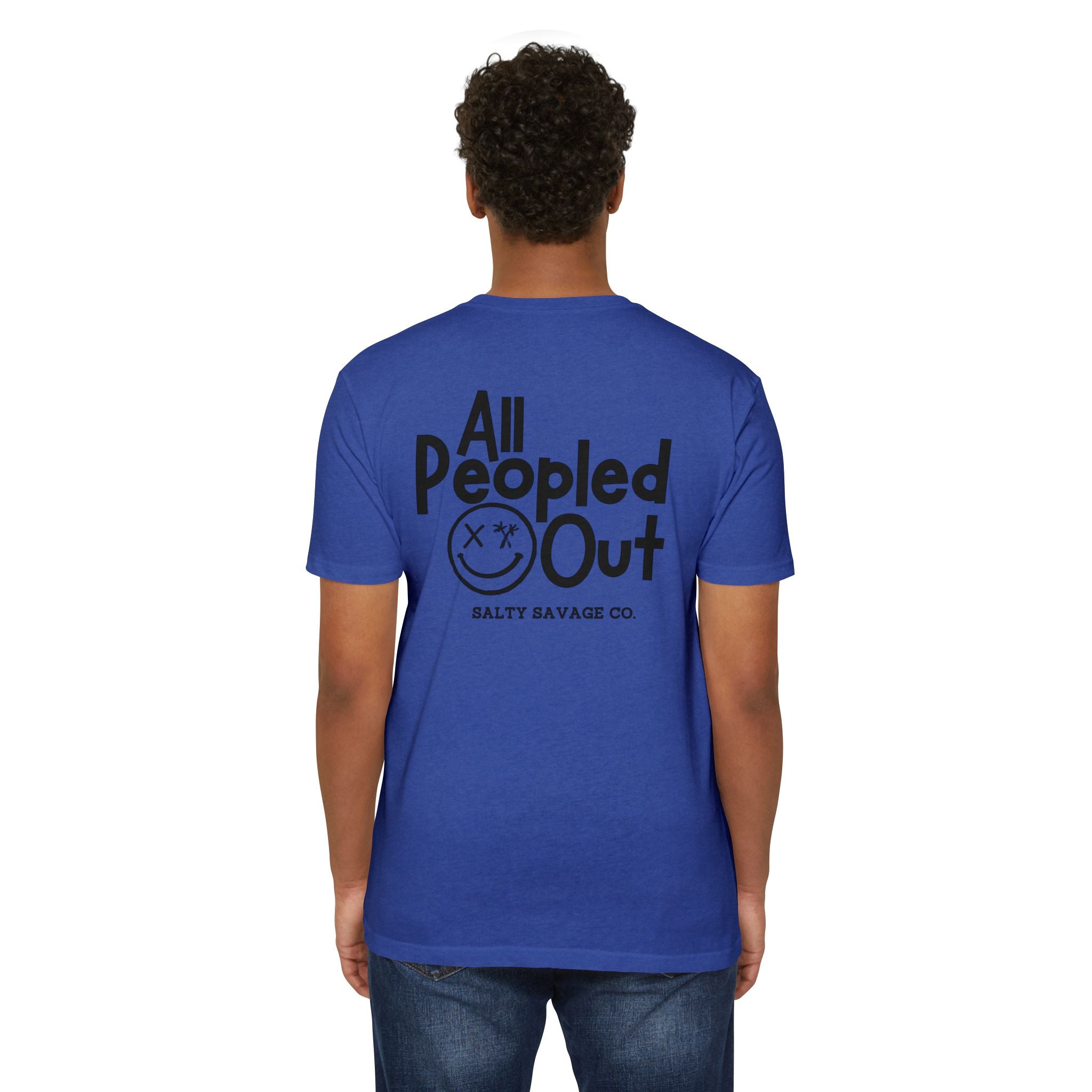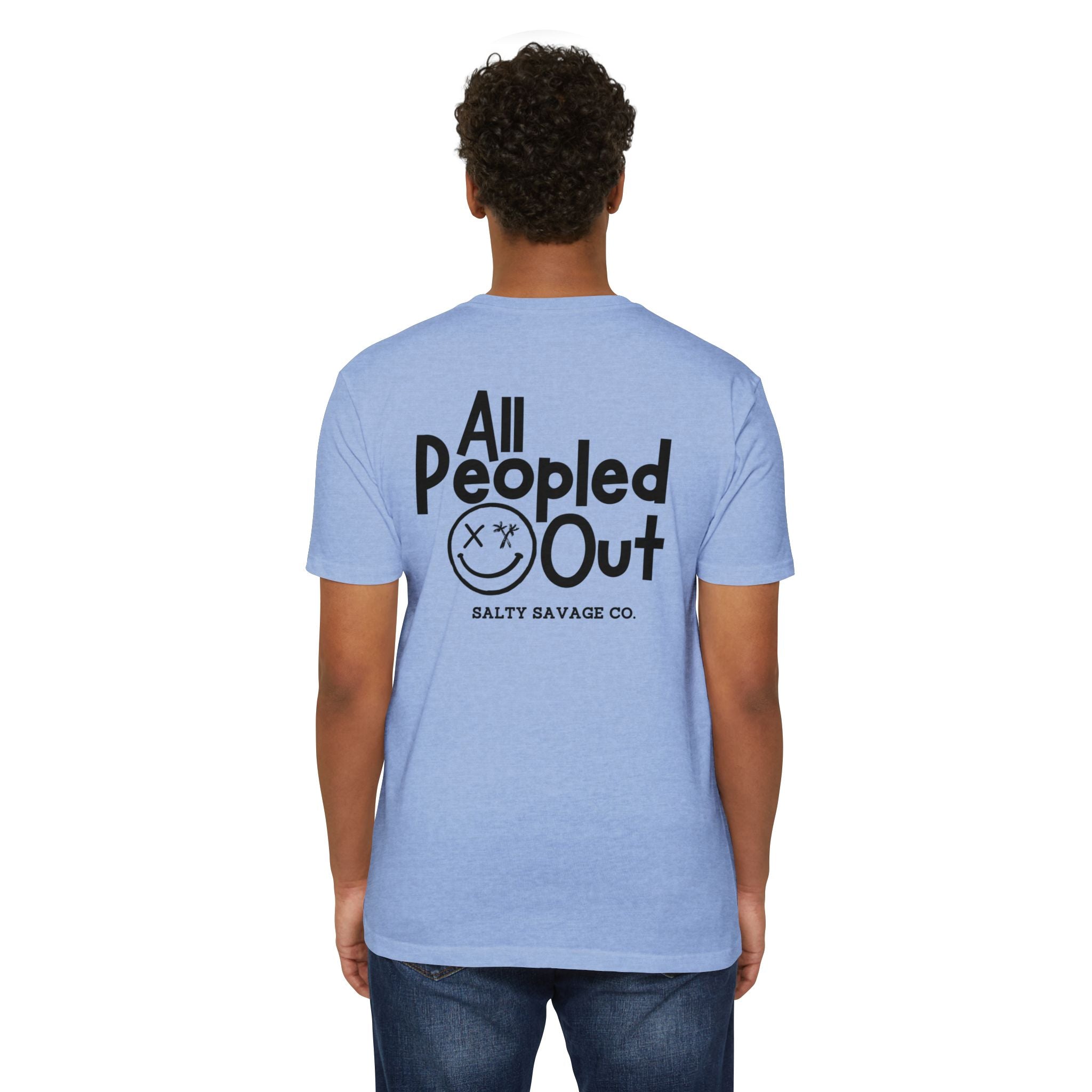 Light, breezy, and a little delightfully sardonic — this tee carries an easygoing attitude you can wear. Soft combed-ring spun cotton blends with polyester to deliver a smooth, lightweight feel that drapes casually without clinging. The front chest mark and larger back graphic read “All Peopled Out” with a playful crossed-out smiley, giving a wink to anyone who’s had their fill of socializing. Throw it on for slow mornings, quiet coffee runs, or when you want to signal low-key vibes without saying a word. The classic fit and resilient ribbed collar keep the silhouette comfortable and familiar, while the tear-away label and clean shoulder taping keep things tidy against the skin. It’s a relaxed layer that reads equal parts mellow and mischievous — for days when small talk is optional and downtime is everything.