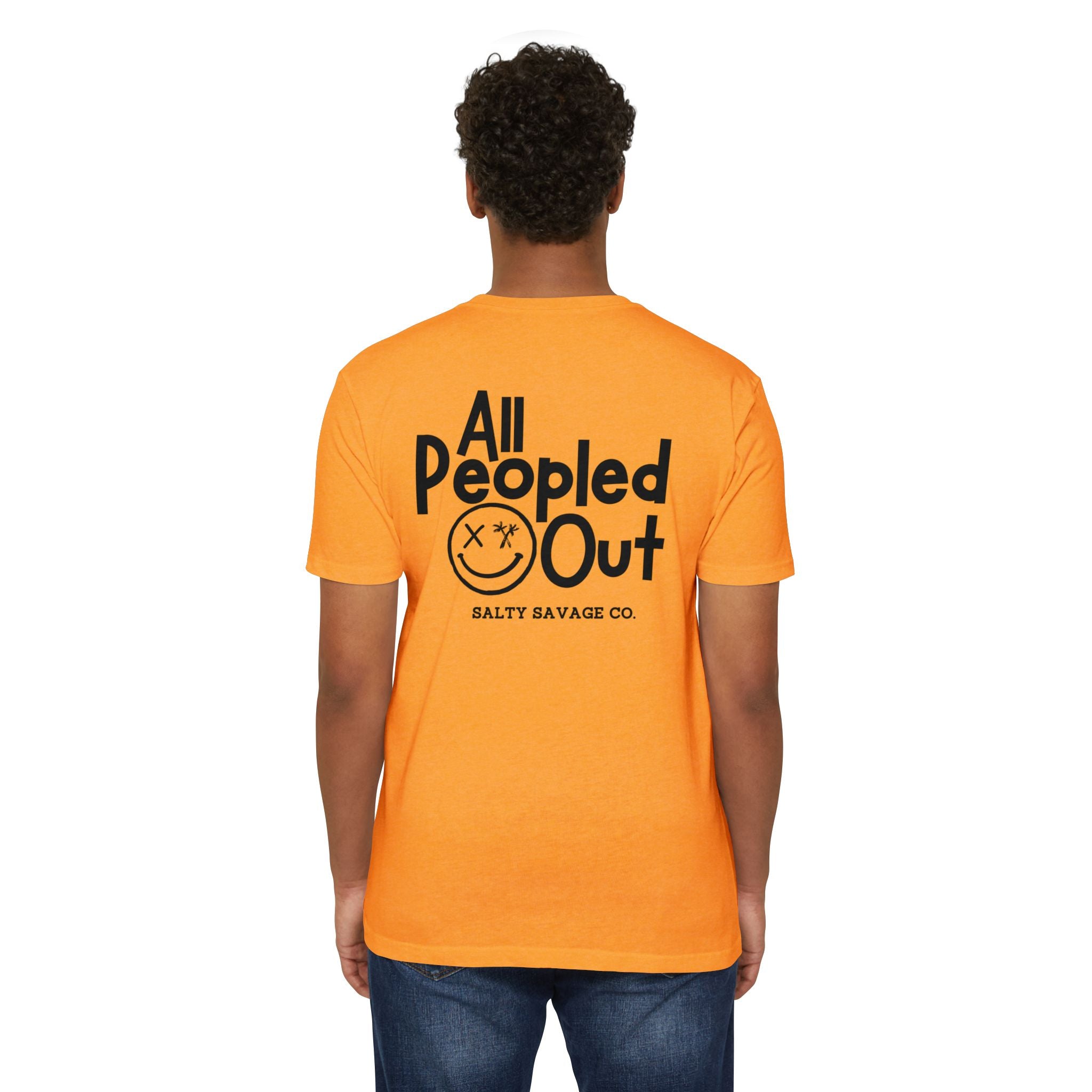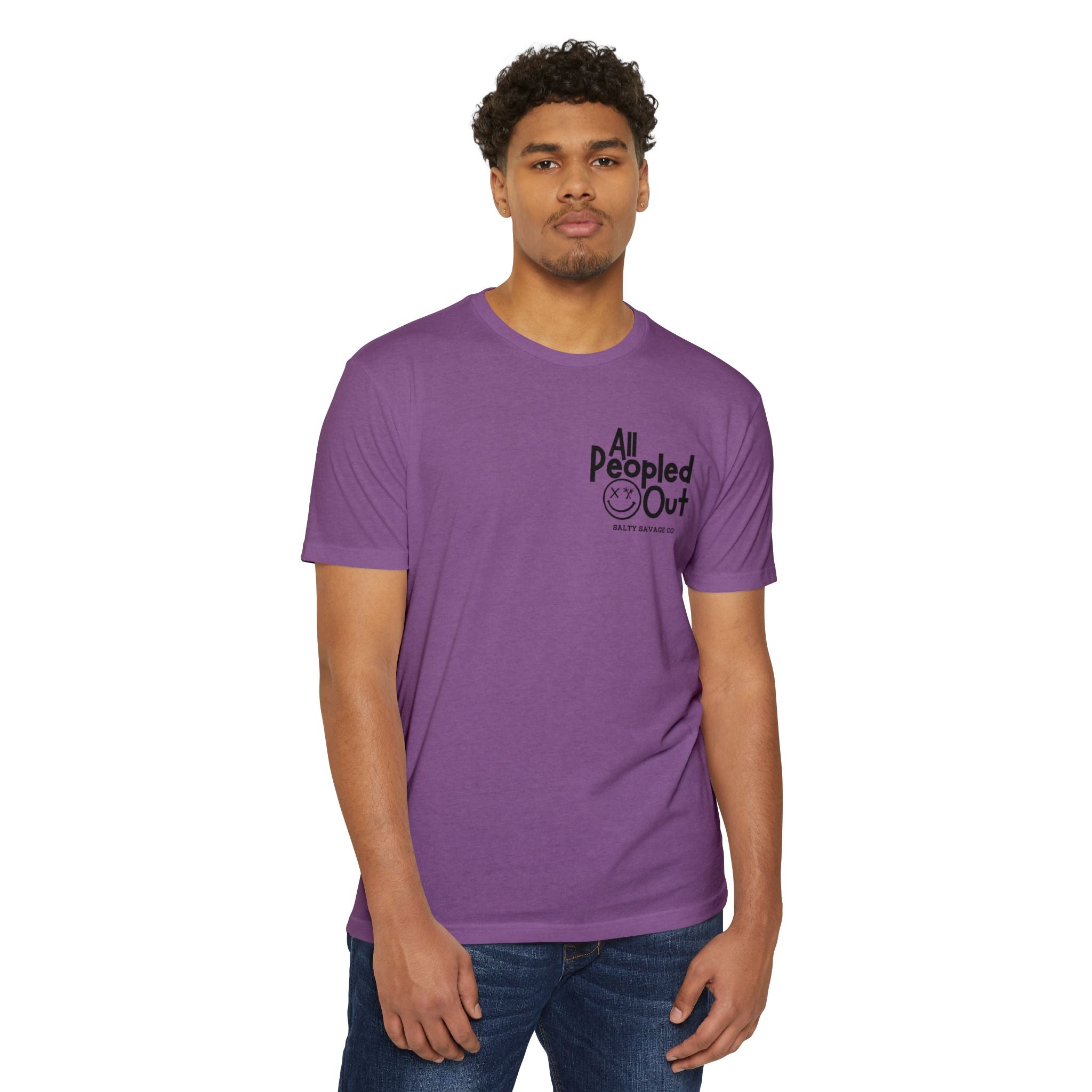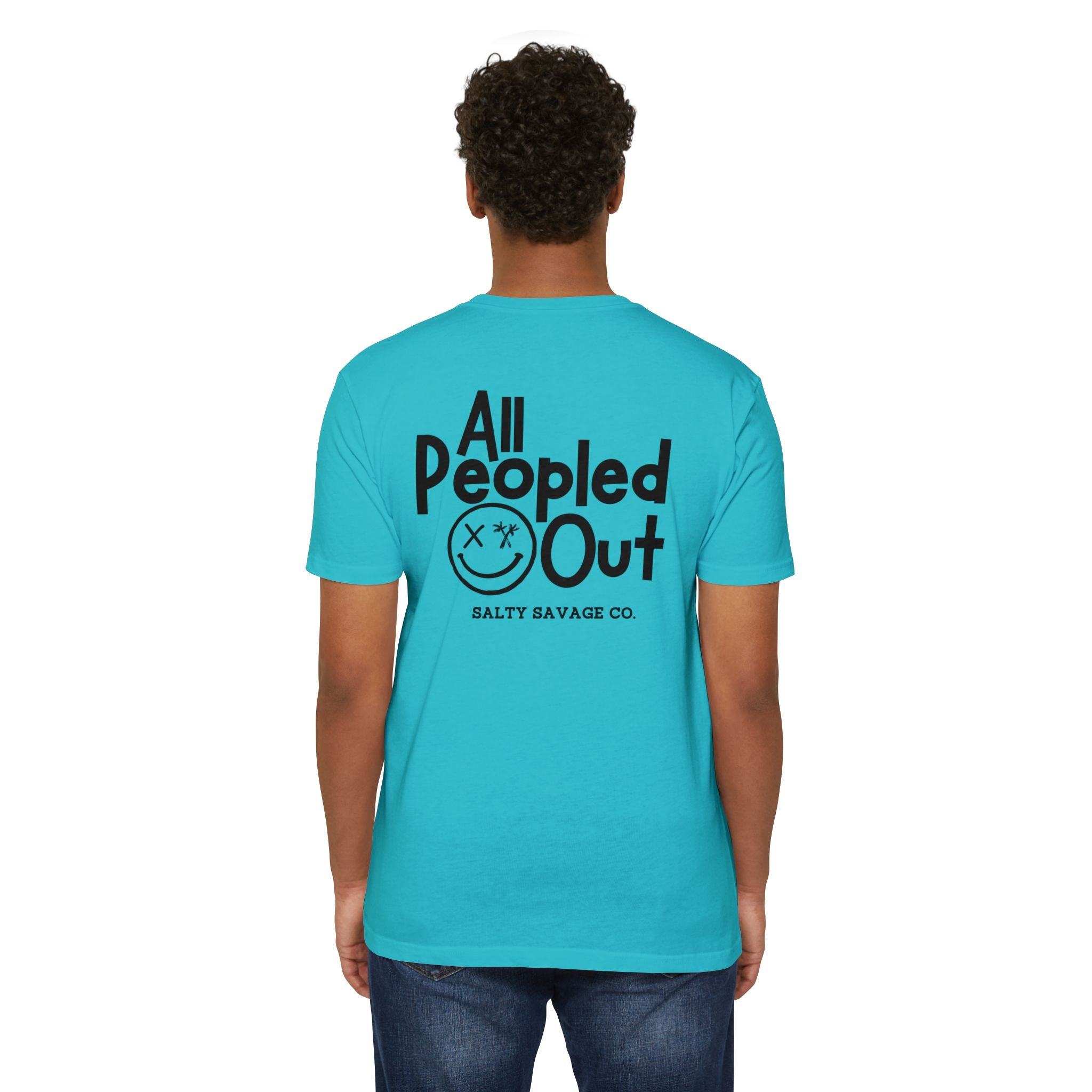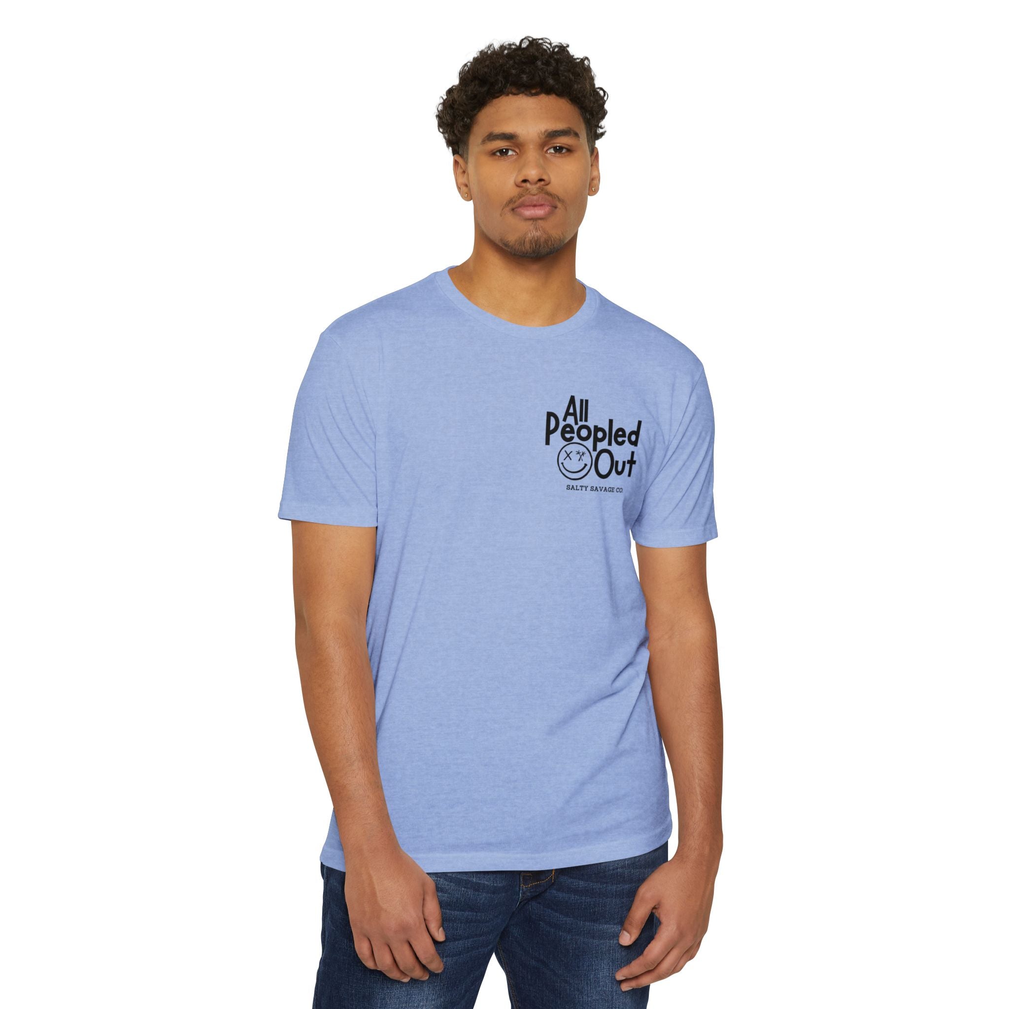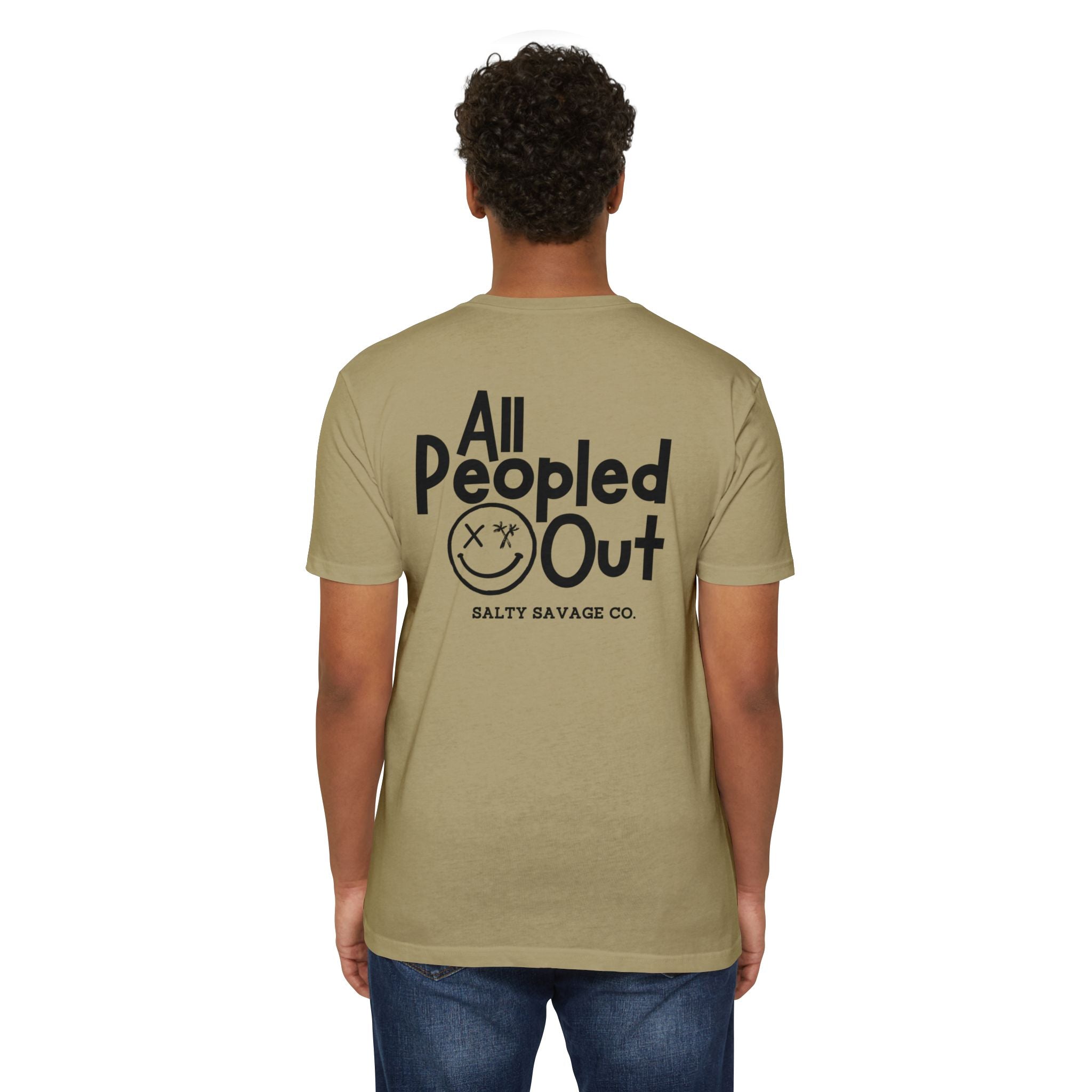 Light, breezy, and a little delightfully sardonic — this tee carries an easygoing attitude you can wear. Soft combed-ring spun cotton blends with polyester to deliver a smooth, lightweight feel that drapes casually without clinging. The front chest mark and larger back graphic read “All Peopled Out” with a playful crossed-out smiley, giving a wink to anyone who’s had their fill of socializing. Throw it on for slow mornings, quiet coffee runs, or when you want to signal low-key vibes without saying a word. The classic fit and resilient ribbed collar keep the silhouette comfortable and familiar, while the tear-away label and clean shoulder taping keep things tidy against the skin. It’s a relaxed layer that reads equal parts mellow and mischievous — for days when small talk is optional and downtime is everything.