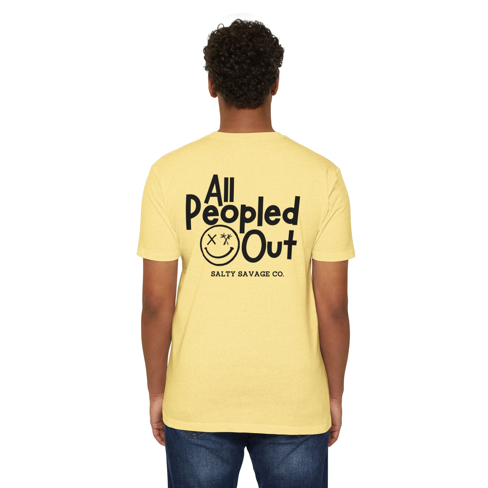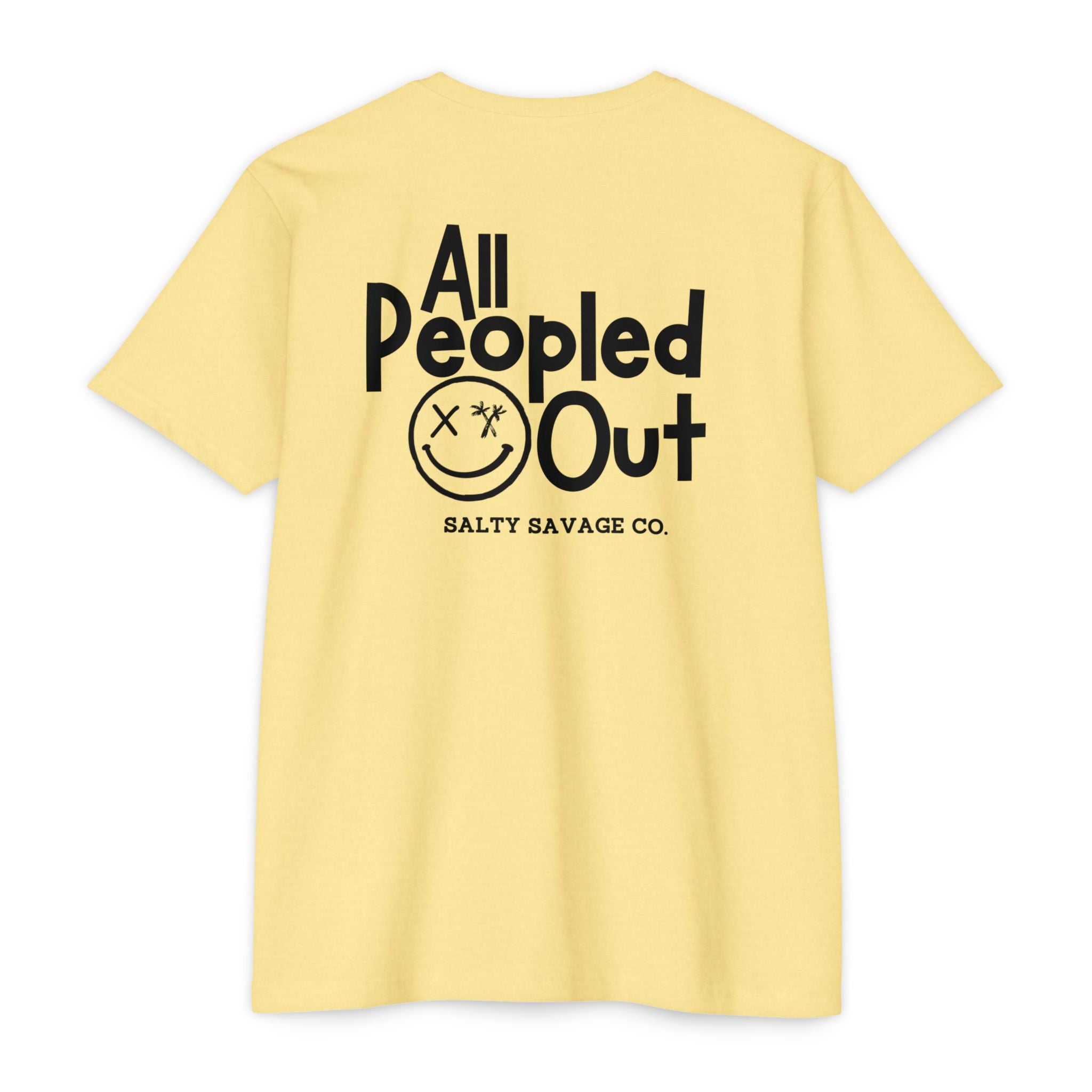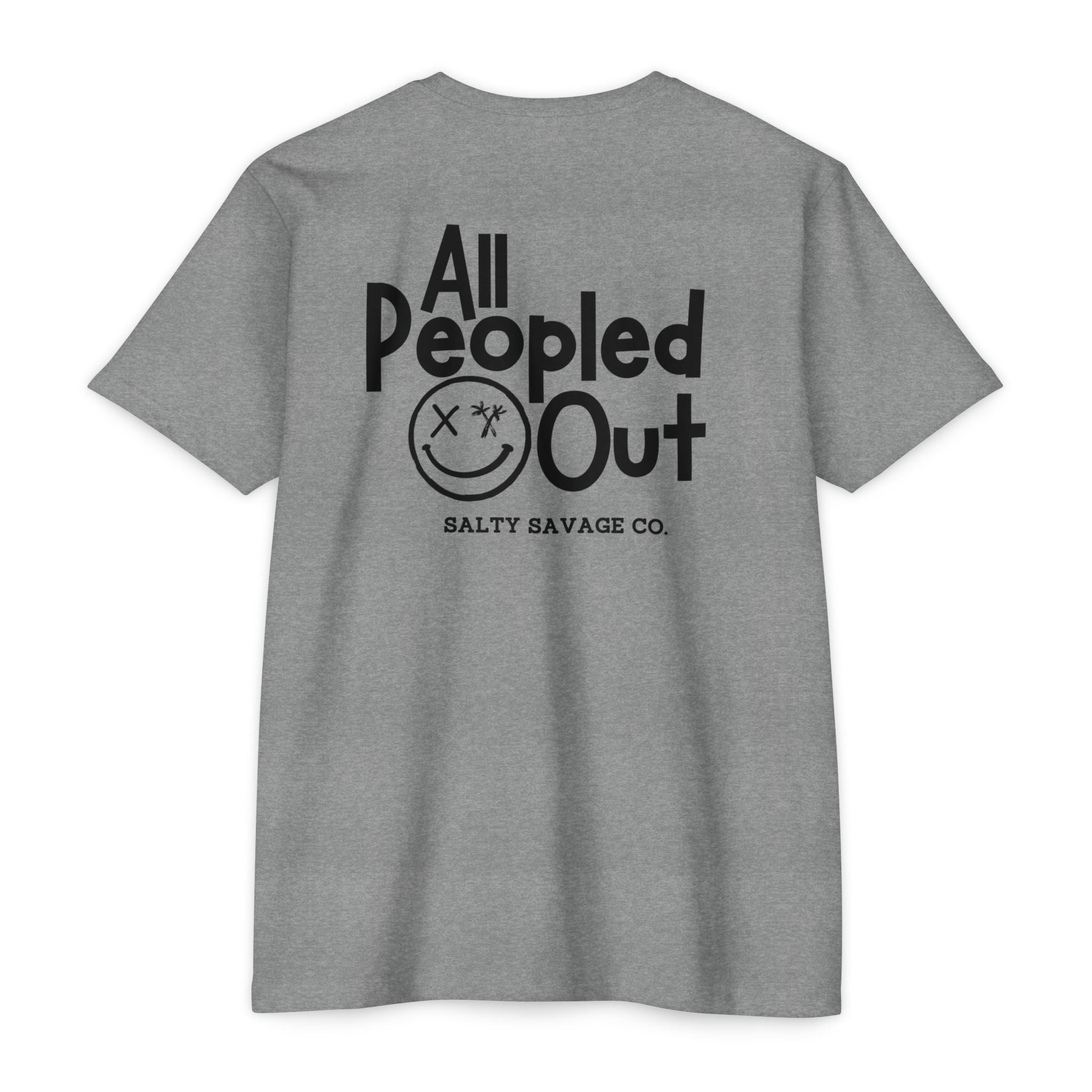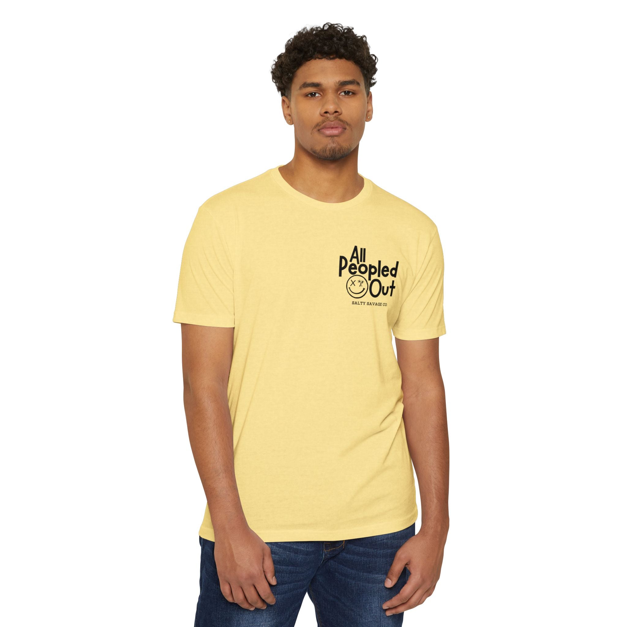 Light, breezy, and a little delightfully sardonic — this tee carries an easygoing attitude you can wear. Soft combed-ring spun cotton blends with polyester to deliver a smooth, lightweight feel that drapes casually without clinging. The front chest mark and larger back graphic read “All Peopled Out” with a playful crossed-out smiley, giving a wink to anyone who’s had their fill of socializing. Throw it on for slow mornings, quiet coffee runs, or when you want to signal low-key vibes without saying a word. The classic fit and resilient ribbed collar keep the silhouette comfortable and familiar, while the tear-away label and clean shoulder taping keep things tidy against the skin. It’s a relaxed layer that reads equal parts mellow and mischievous — for days when small talk is optional and downtime is everything.