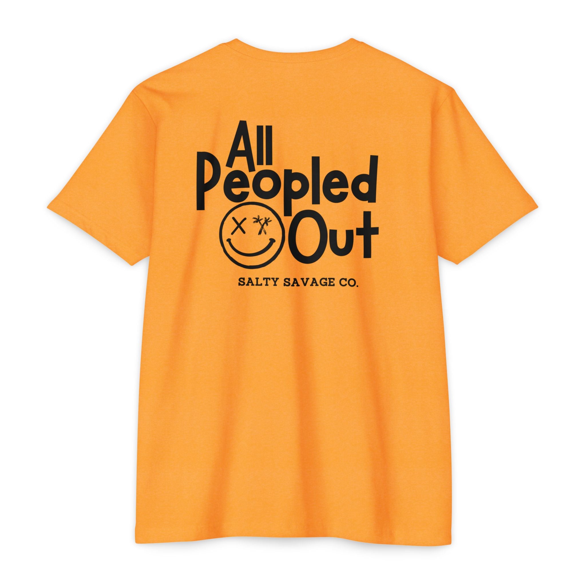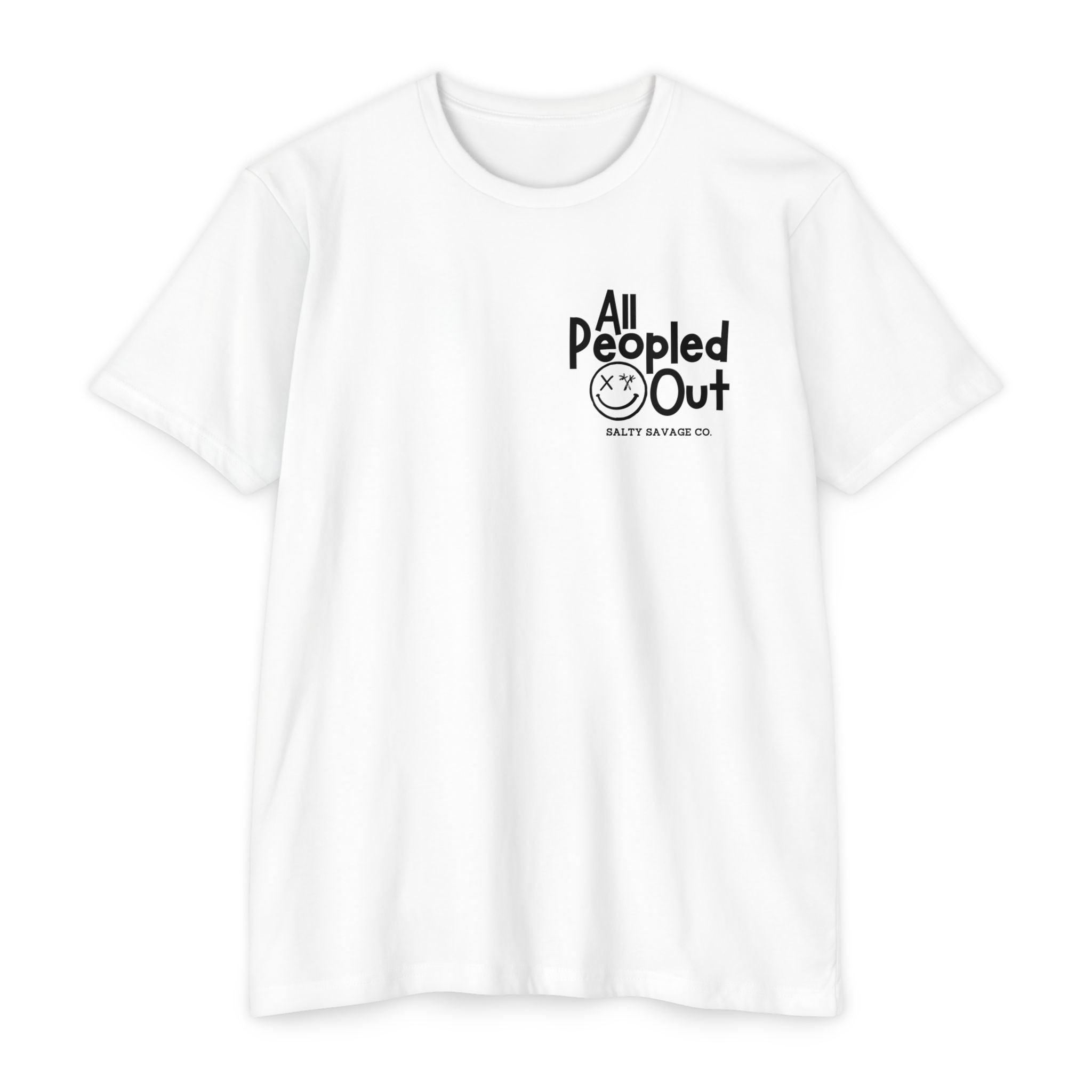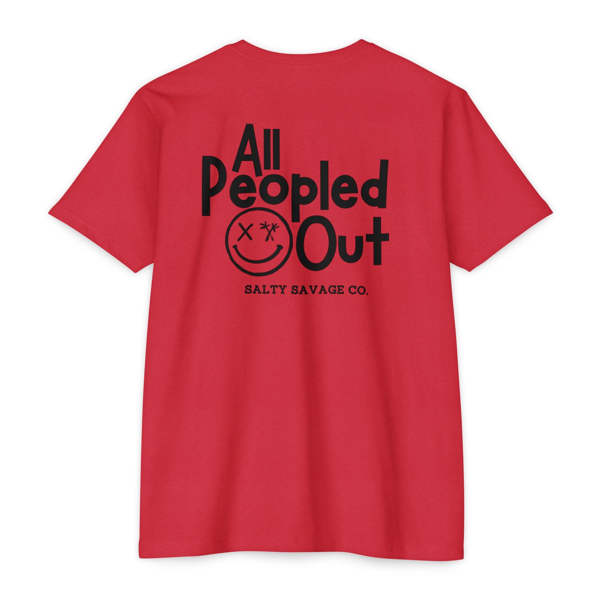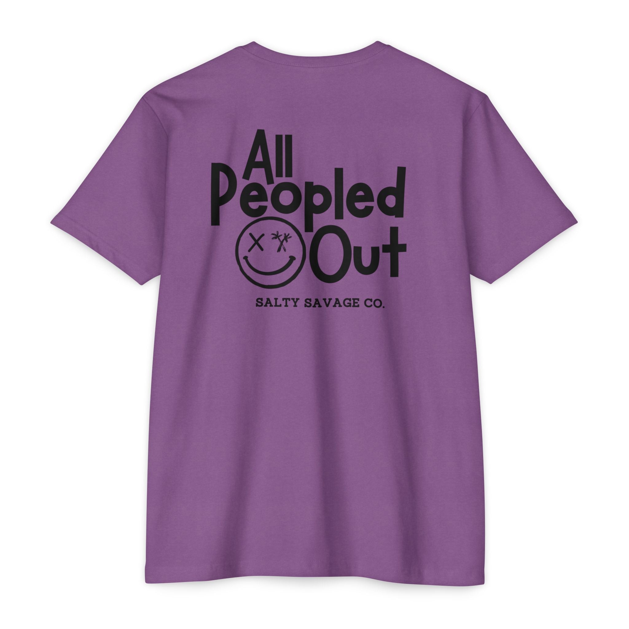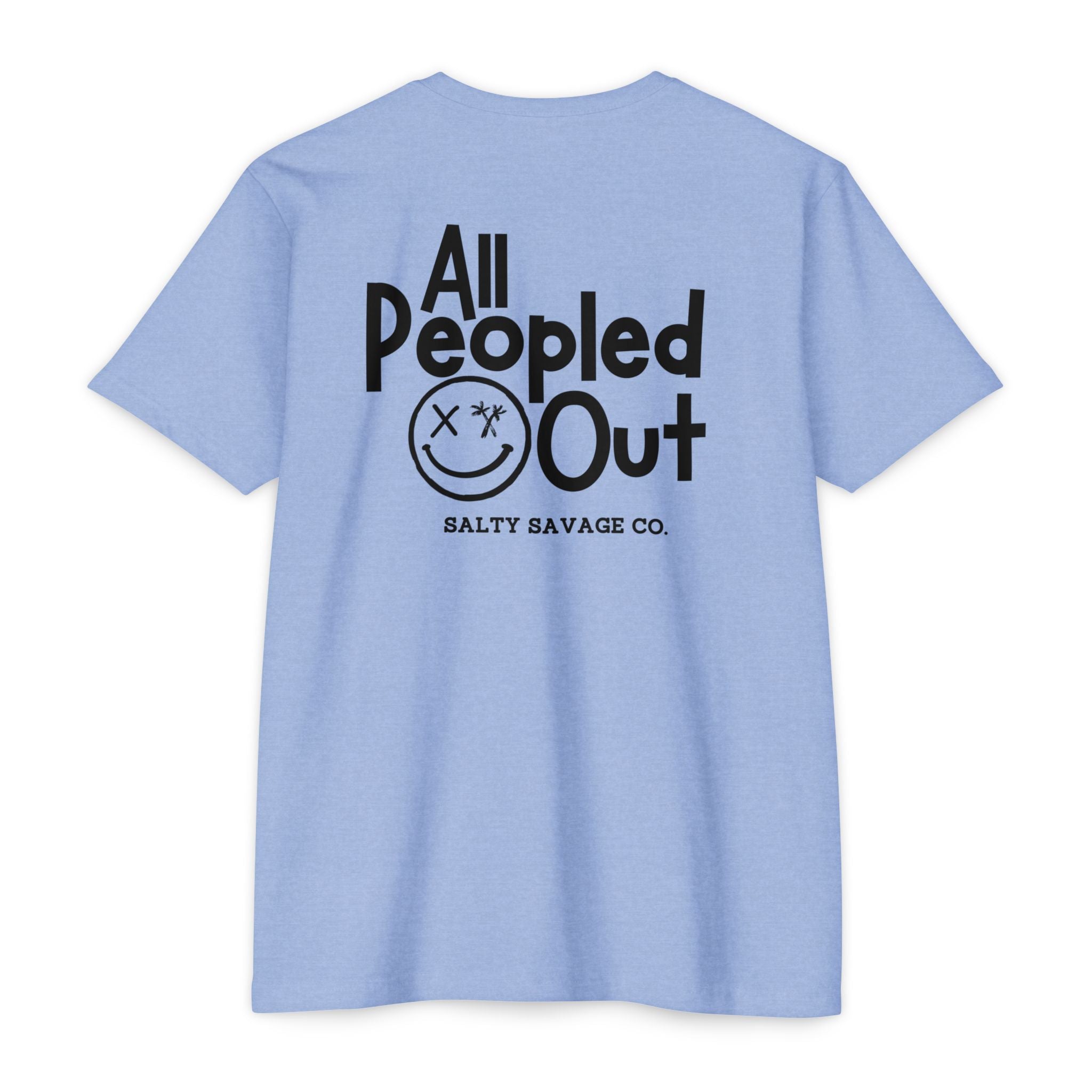 Light, breezy, and a little delightfully sardonic — this tee carries an easygoing attitude you can wear. Soft combed-ring spun cotton blends with polyester to deliver a smooth, lightweight feel that drapes casually without clinging. The front chest mark and larger back graphic read “All Peopled Out” with a playful crossed-out smiley, giving a wink to anyone who’s had their fill of socializing. Throw it on for slow mornings, quiet coffee runs, or when you want to signal low-key vibes without saying a word. The classic fit and resilient ribbed collar keep the silhouette comfortable and familiar, while the tear-away label and clean shoulder taping keep things tidy against the skin. It’s a relaxed layer that reads equal parts mellow and mischievous — for days when small talk is optional and downtime is everything.