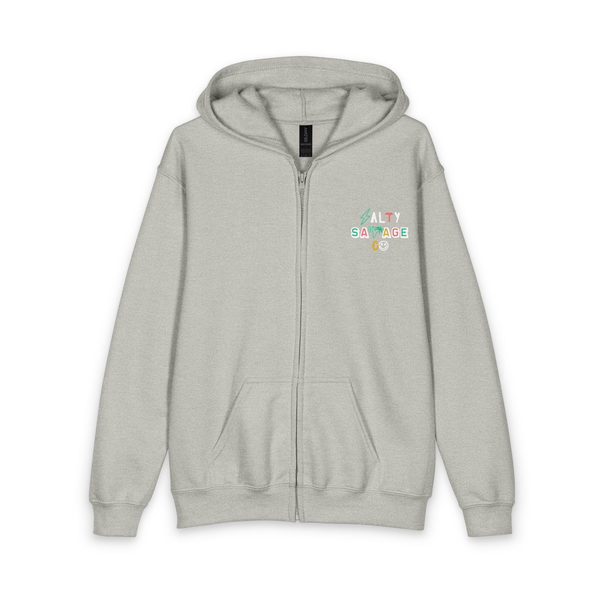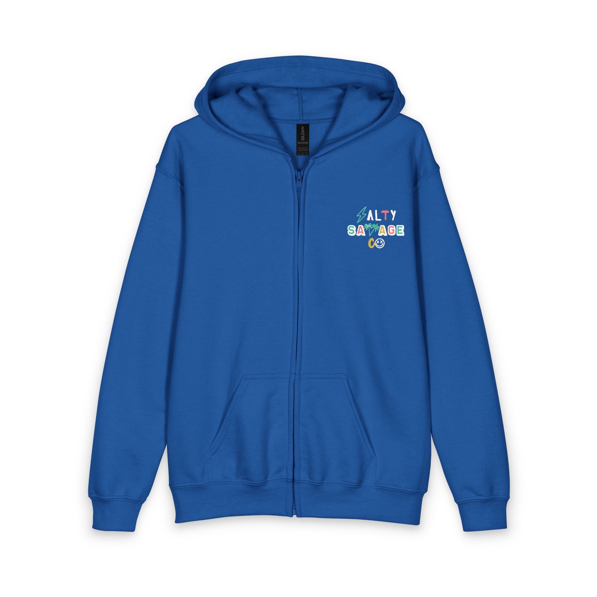Product features - 50% cotton / 50% polyester midweight (8 oz/yd²) for durability and smooth print surface - Full-zip design with durable self-colored plastic zipper and metal pull - Pouch pocket for hands and small essentials - Unlined hood and classic fit for easy layering - Tear-away label and tags for itch-free comfort