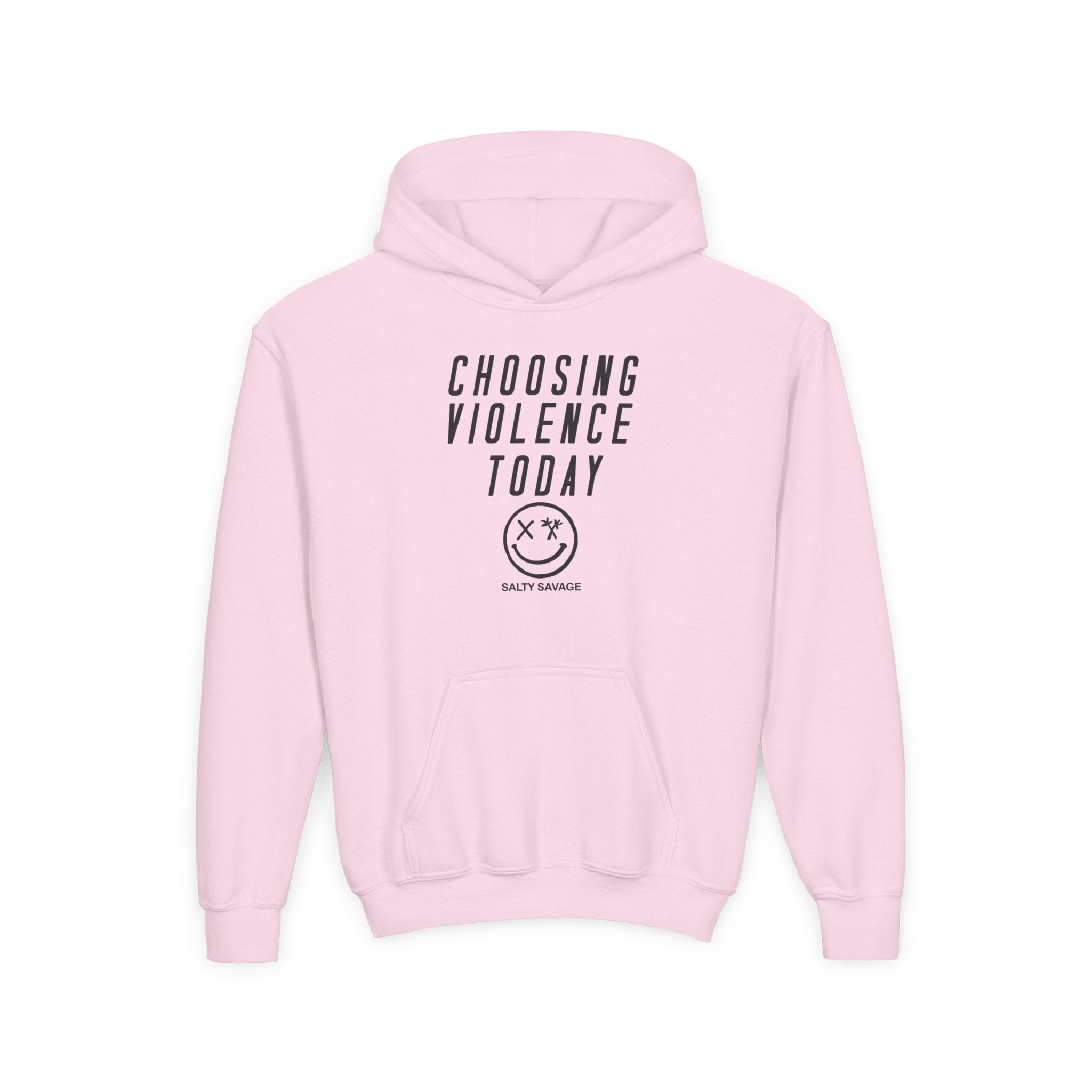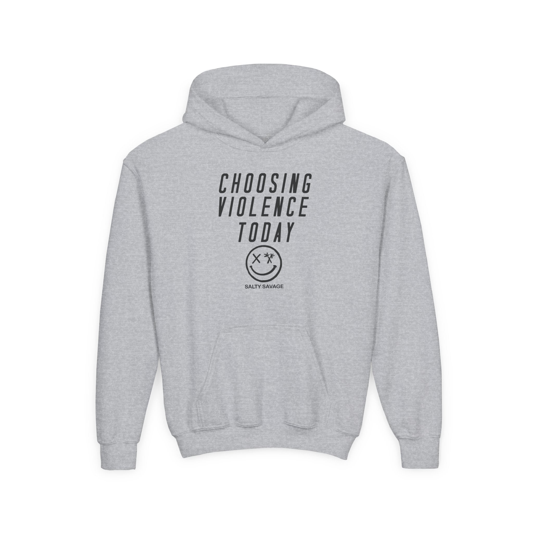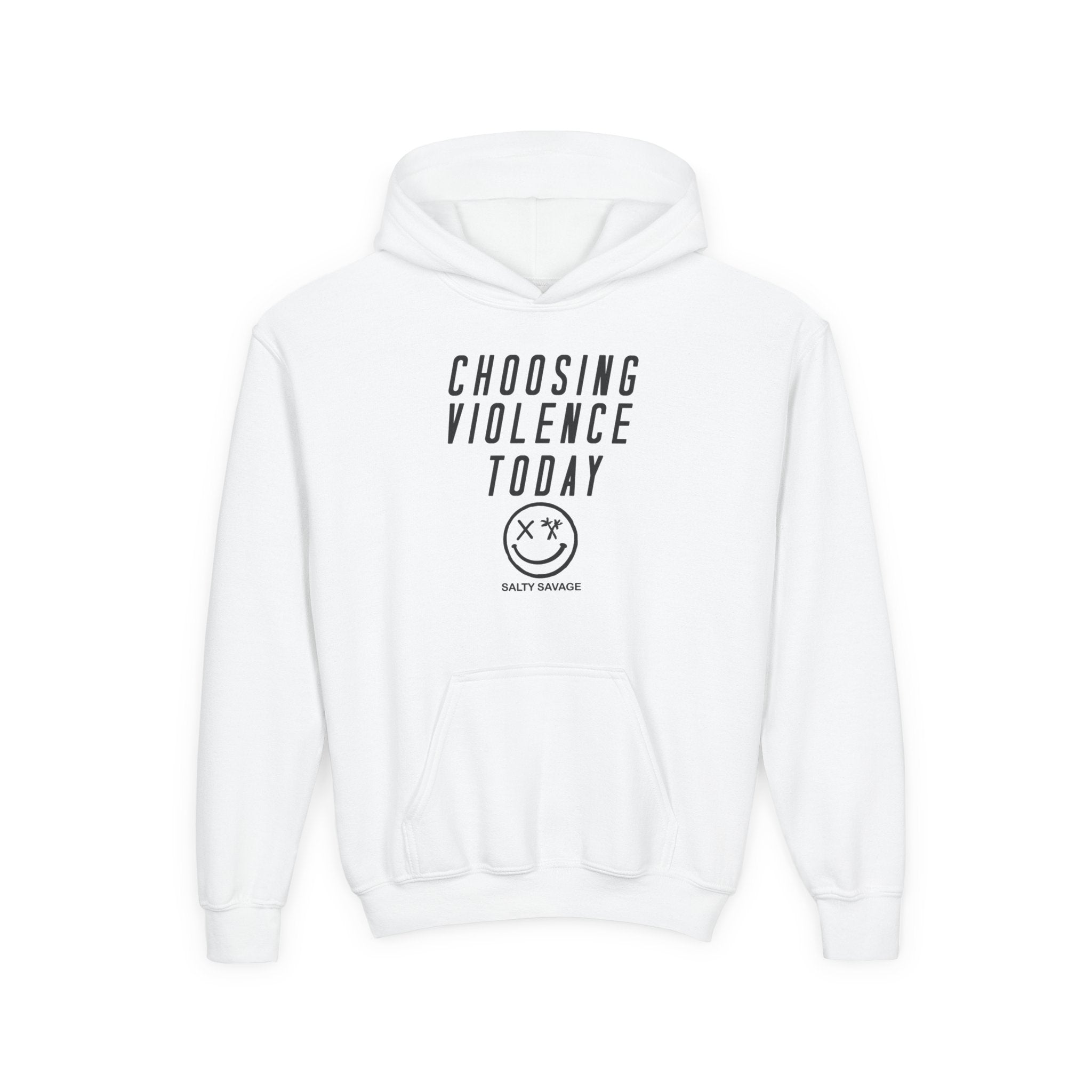 This youth hoodie carries a bold, offbeat attitude in a soft, dependable package. The clean white canvas puts the minimal graphic — tall, condensed lettering above a simple smiley face — front and center, so the statement reads loud and clear without shouting. It feels familiar and a little rebellious: the roomy kangaroo pocket for chilly hands, a lined hood for extra coziness, and medium-weight fabric that stands up to play, school days, and weekend hangouts. Comfortable, true-to-size cut keeps movement easy while the twill necktape and sewn-in label add small structural touches that last through washes. Subtle wrist printing and optional chest embroidery give steering options between printed edge and neat embroidered detail. For kids who like to push boundaries with a dry wink, this hoodie slides into everyday life and seasons of independent style.